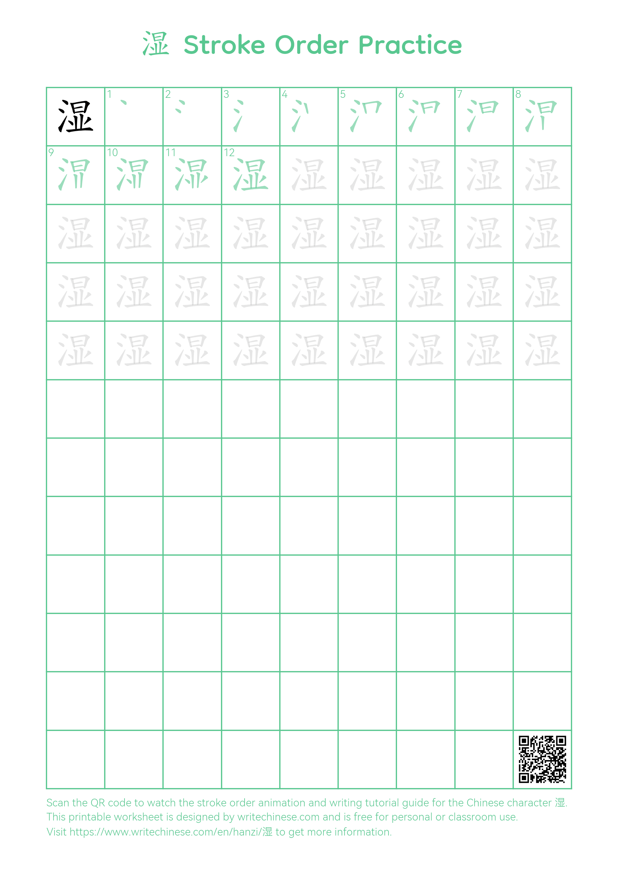 Master the Chinese character '湿' stroke by stroke with visual step-by-step instructions.