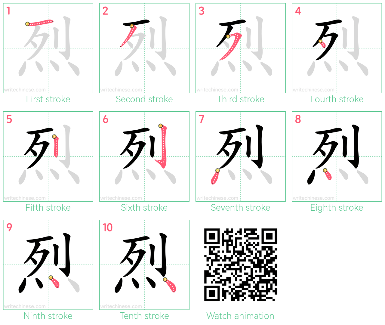 Master the Chinese character '烈' stroke by stroke with visual step-by-step instructions.
