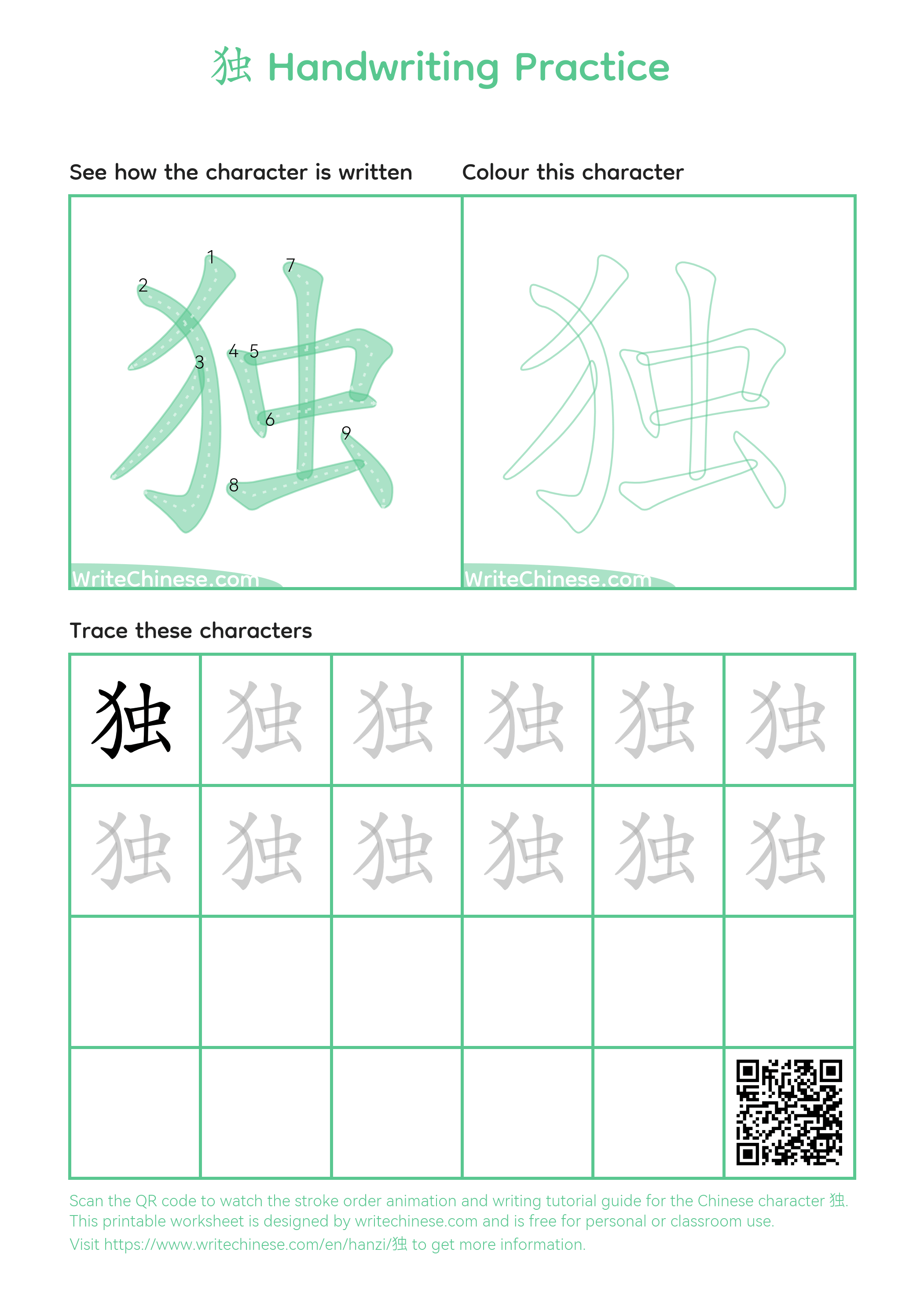 Chinese Character '独'. You can download the printable handwriting worksheets below and