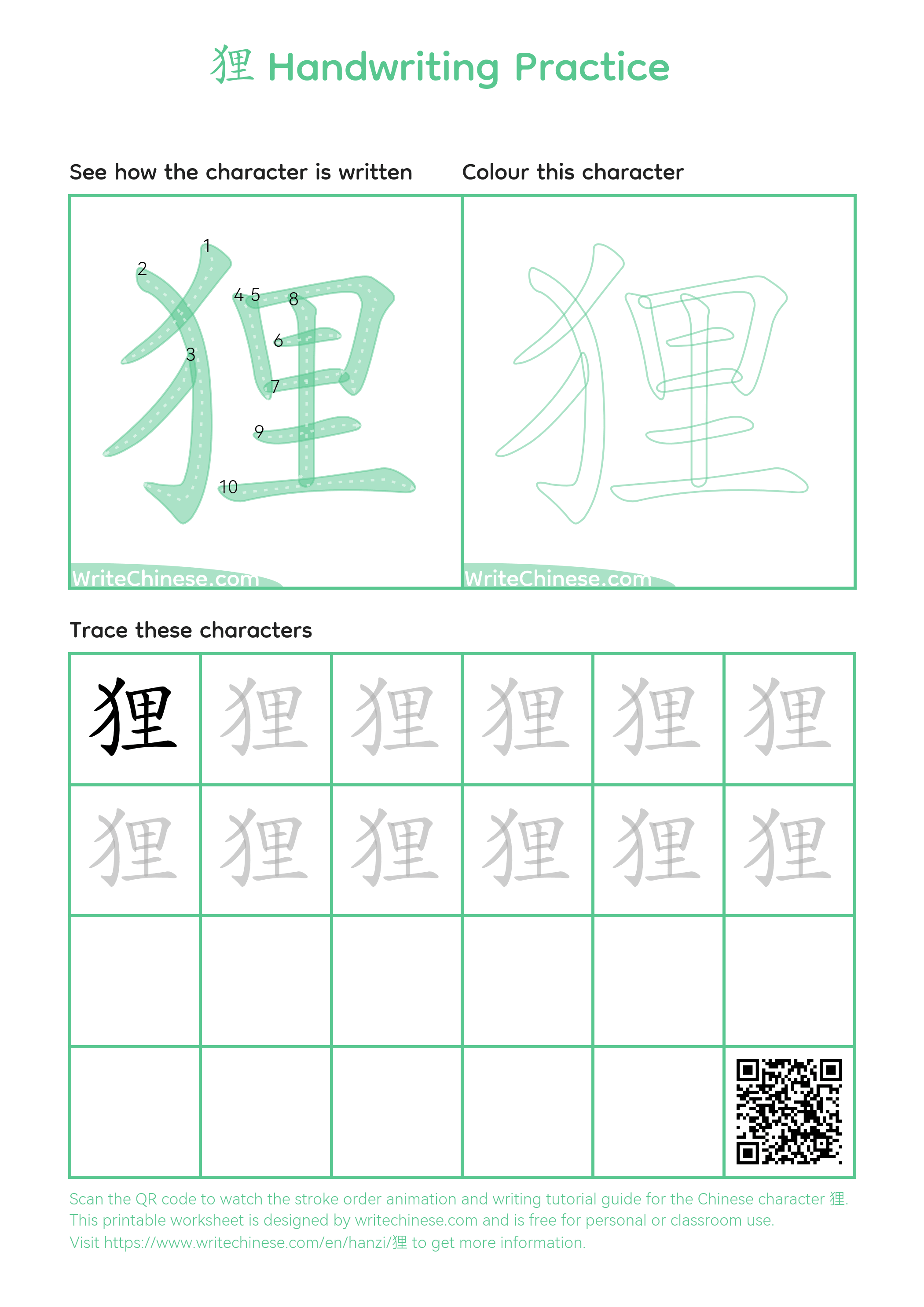 Chinese Character '狸'. You can download the printable handwriting worksheets below and