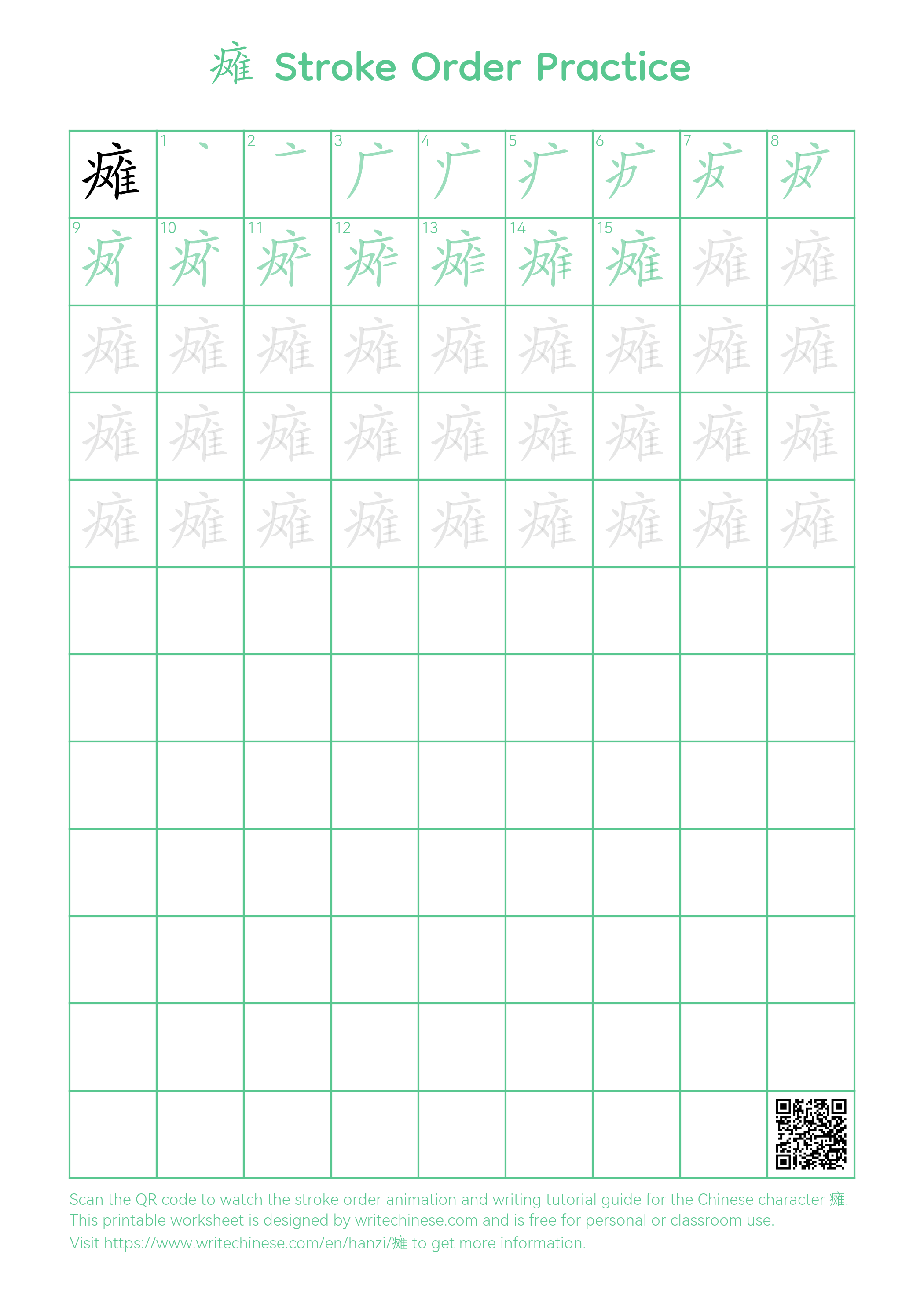 Learn the proper way to write the Chinese character '瘫' through a video tutorial with a calligraphy teacher. Follow the Calligraphy Master's Step-by-Step Guide to Write the Chinese Character '瘫'. You can download the printable handwriting worksheets below and practice writing together with pen and paper.