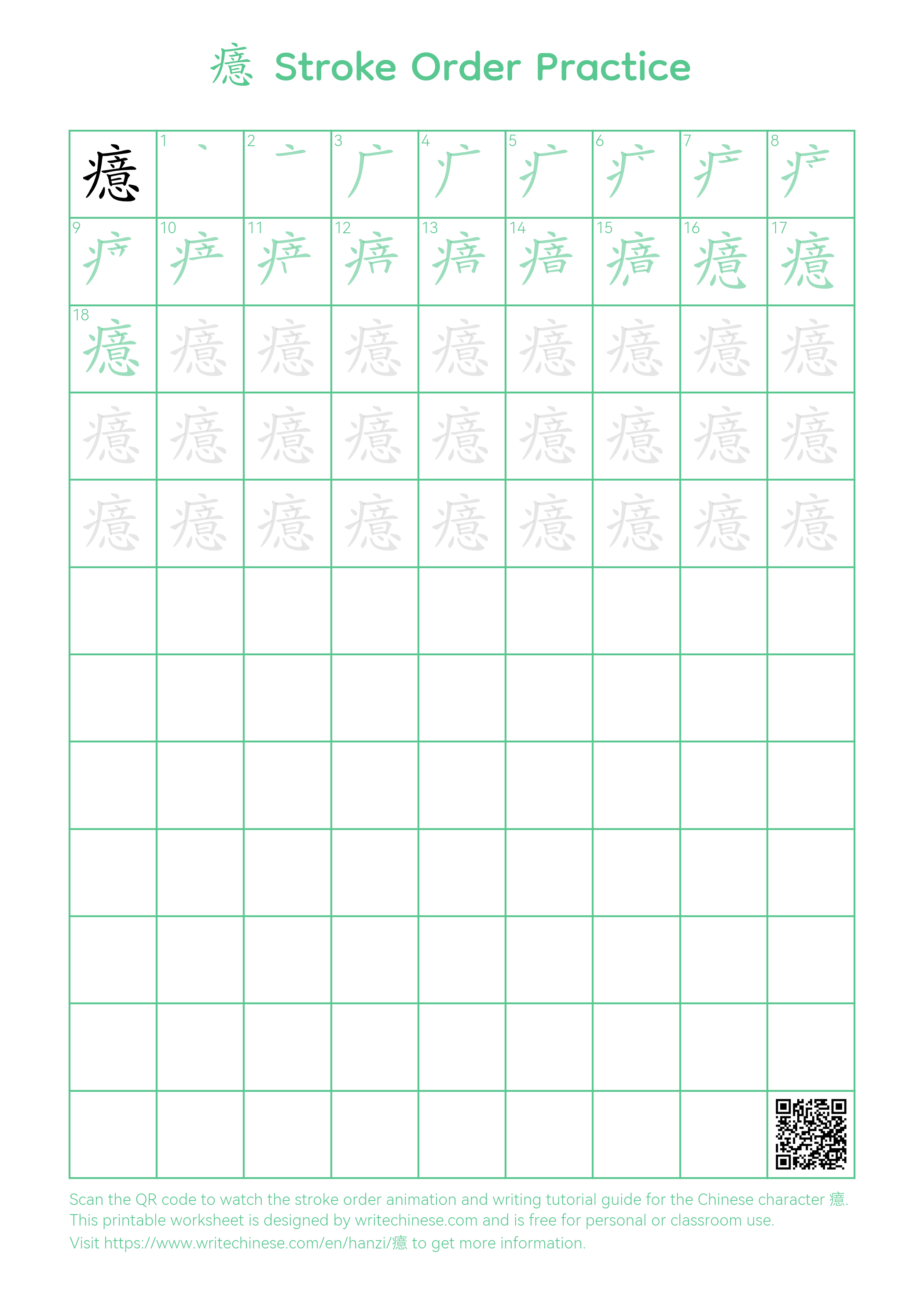 Master the Chinese character '癔' stroke by stroke with visual step-by-step instructions.