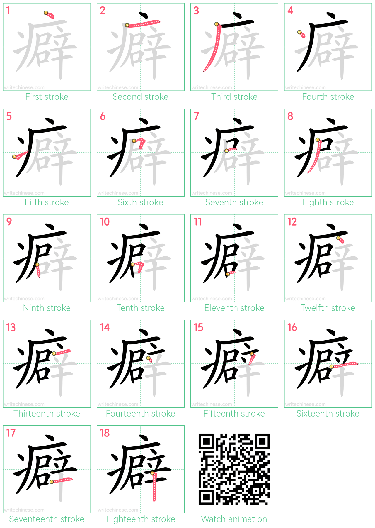 Master the Chinese character '癖' stroke by stroke with visual step-by-step instructions.