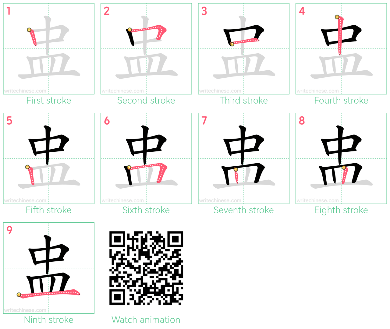 Master the Chinese character '盅' stroke by stroke with visual step-by-step instructions.