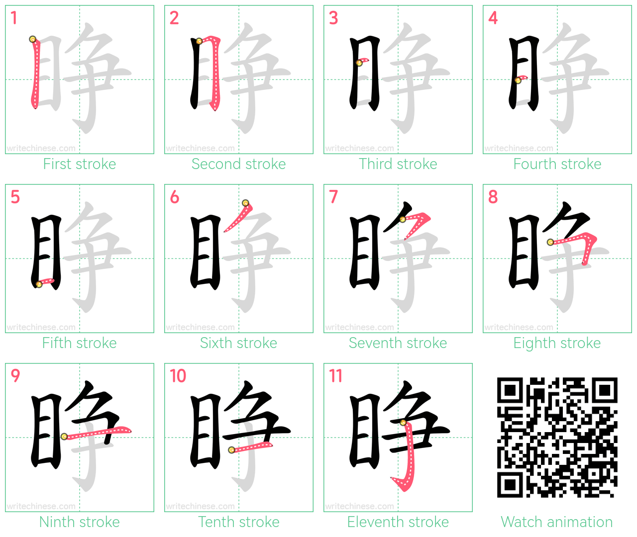 Master the Chinese character '睁' stroke by stroke with visual step-by-step instructions.