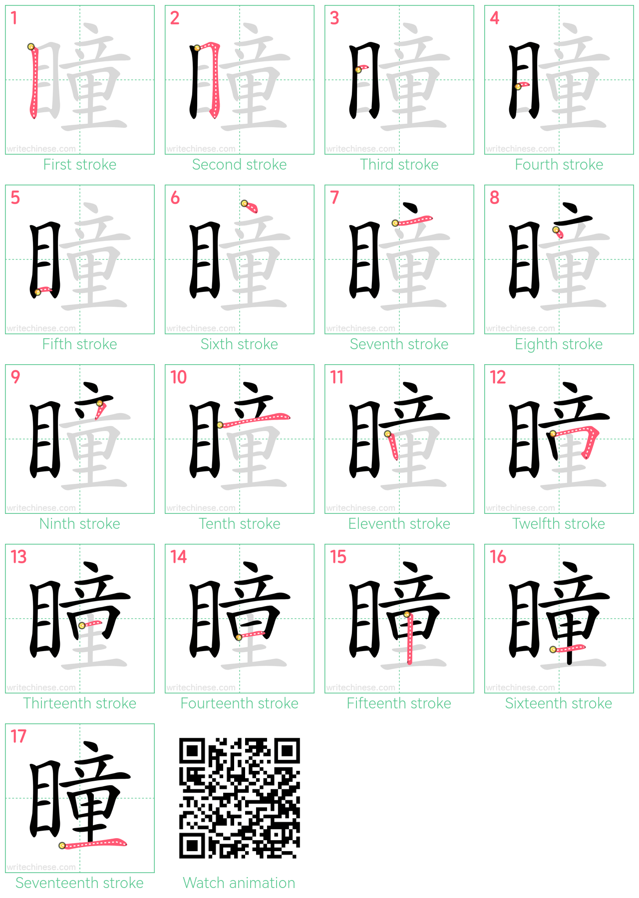 Learn to write the Chinese character "瞳" by watching the stroke order animation of "瞳".