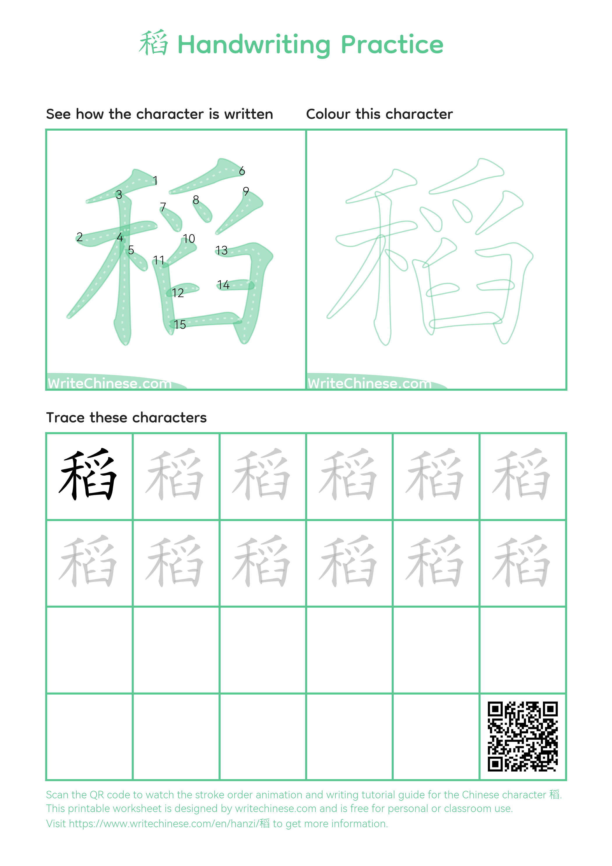 Chinese Character '稻'. You can download the printable handwriting worksheets below and