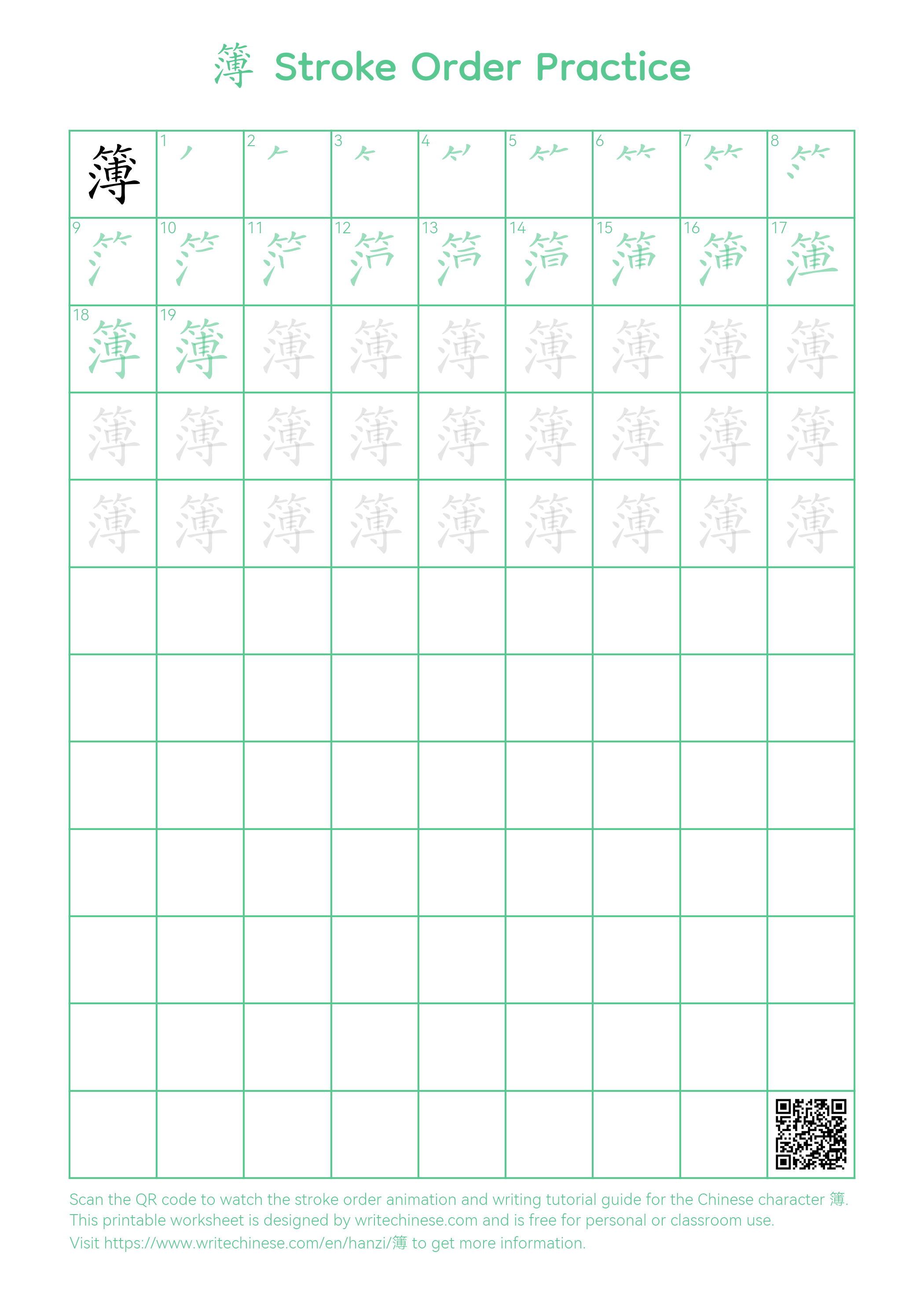 Chinese Character '簿'. You can download the printable handwriting worksheets below and