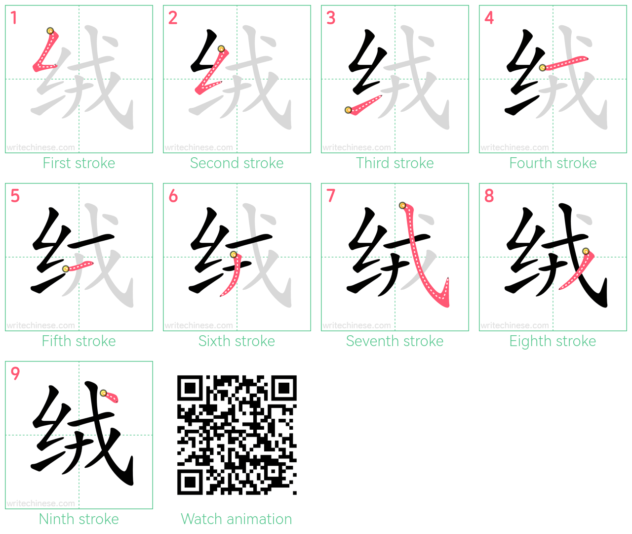 Master the Chinese character '绒' stroke by stroke with visual step-by-step instructions.
