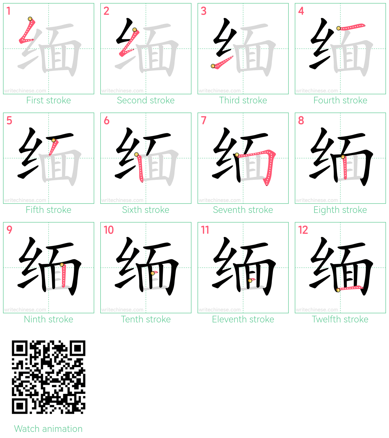 Master the Chinese character '缅' stroke by stroke with visual step-by-step instructions.