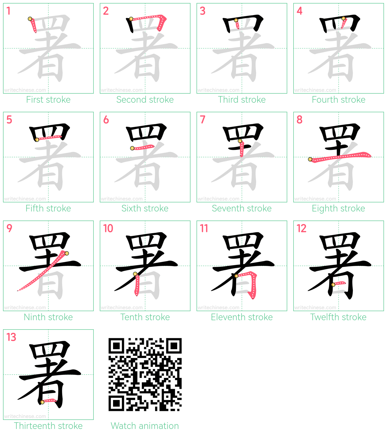 Master the Chinese character '署' stroke by stroke with visual step-by-step instructions.