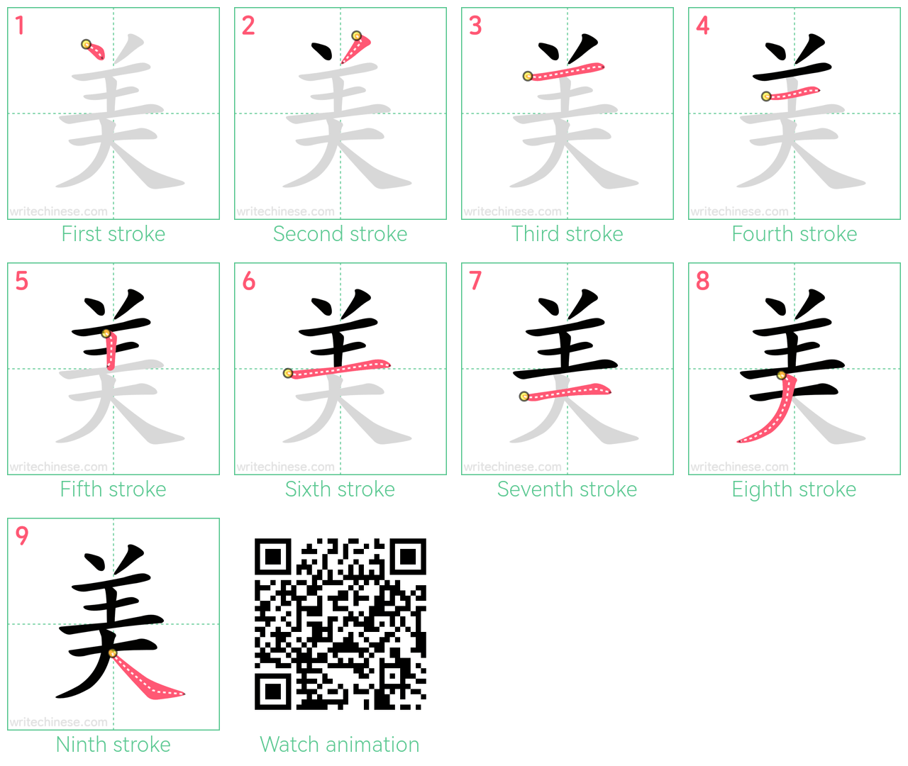 美 [měi] 1. 好,善。 Good; virtuous. 2. 得意,高兴。 Proud; happy. 3. 称赞,以为好。 Praise; consider good. 4. 指“亚美利加洲”(简称“美洲”)。 Refers to "America" (abbreviated as "the Americas"). 5. 指“美国”。 Refers to "the United States". 6. 好,善:~德。~学。~谈。审~。~丽。~容(美化容貌)。~不胜收。 Good; virtuous: virtuous morality; good studies; nice conversation; aesthetic appreciation; beautiful; beautify appearance; too beautiful to go unnoticed. 7. 得意,高兴:~滋滋的。 Proud and happy: feeling pleased with oneself. 8. 称赞,以为好:赞~。~言。~誉。 Praise; consider good: praise; commendation; good reputation. 9. 指“亚美利加洲”(简称“美洲”):北~。南~。 Refers to "America" (the Americas): North America; South America. 10. 指“美国”:~元。~籍华人。 Refers to "the United States": American dollar; Chinese people in America. 11. 同本义 ([En.] delicious). Same meaning: delicious. 12. 形貌好看,漂亮 ([En.] beautiful; good-looking; handsome; pretty). Good-looking; beautiful. 13. 美好 ([En.] fair; good; nice; fine). Good; fine. 14. 理想 ([En.] ideal). Ideal. 15. 〈方〉∶得意,高兴 ([En.] be pleased with oneself). To be pleased with oneself. 16. 美国的 ([En.] American). American. 17. 称美;赞美 ([En.] praise). To praise; commend. 18. 认为…美;使事物变美,变好 ([En.] beautify). To regard something as beautiful; to make something beautiful or better. 19. 音调的主观单位,等于频率为1000赫的音的音调的千分之一——尤其用于听觉学 ([En.] mel). A subjective unit of pitch, equal to one-thousandth of the pitch of a sound with a frequency of 1000 Hz, especially used in acoustics.
