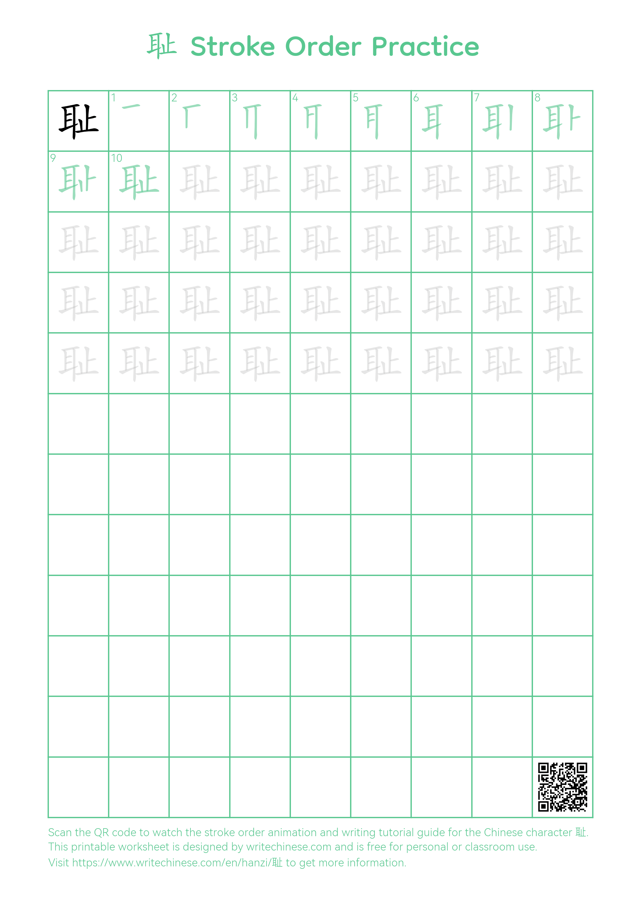 Chinese Character '耻'. You can download the printable handwriting worksheets below and