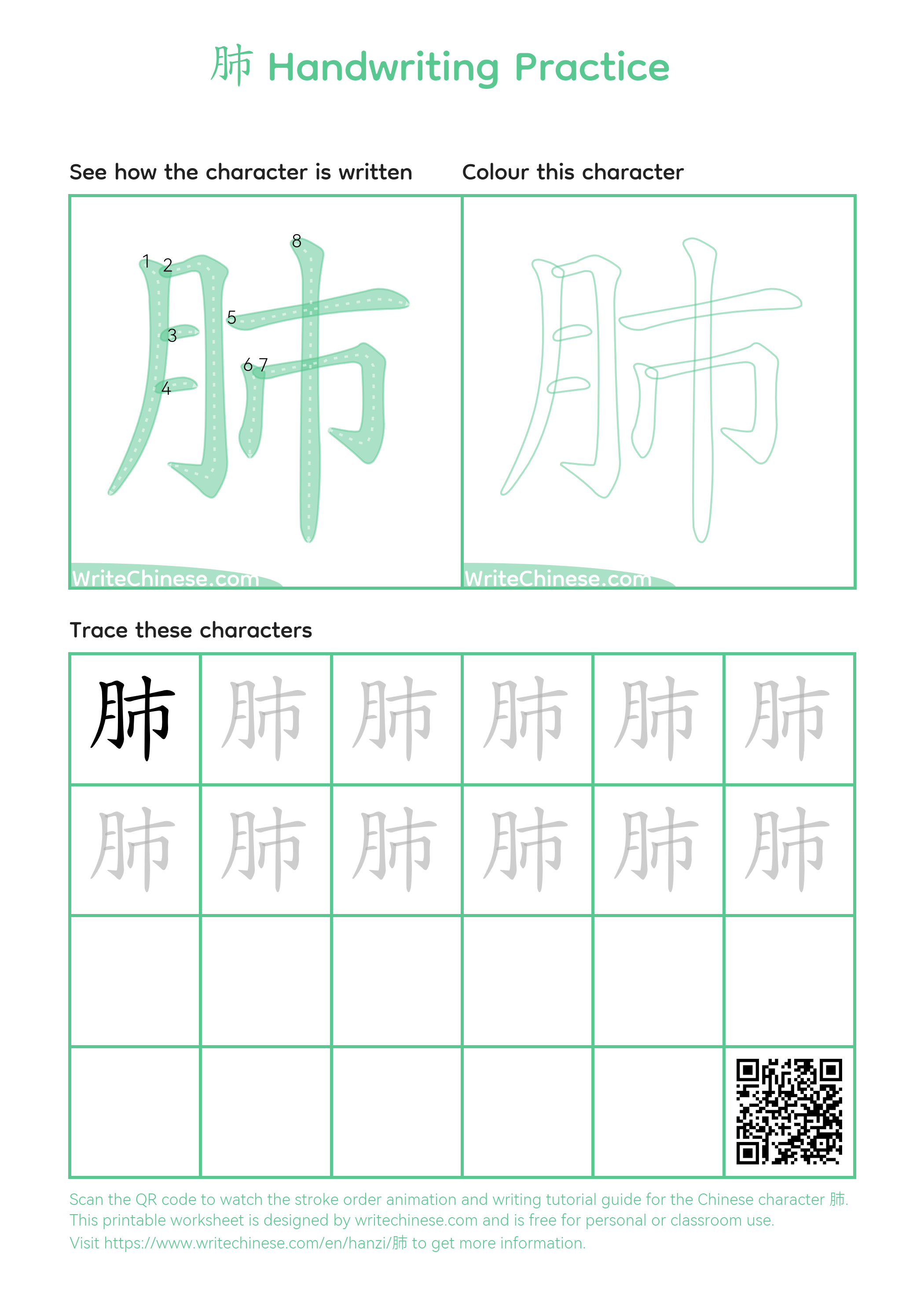 Chinese Character '肺'. You can download the printable handwriting worksheets below and