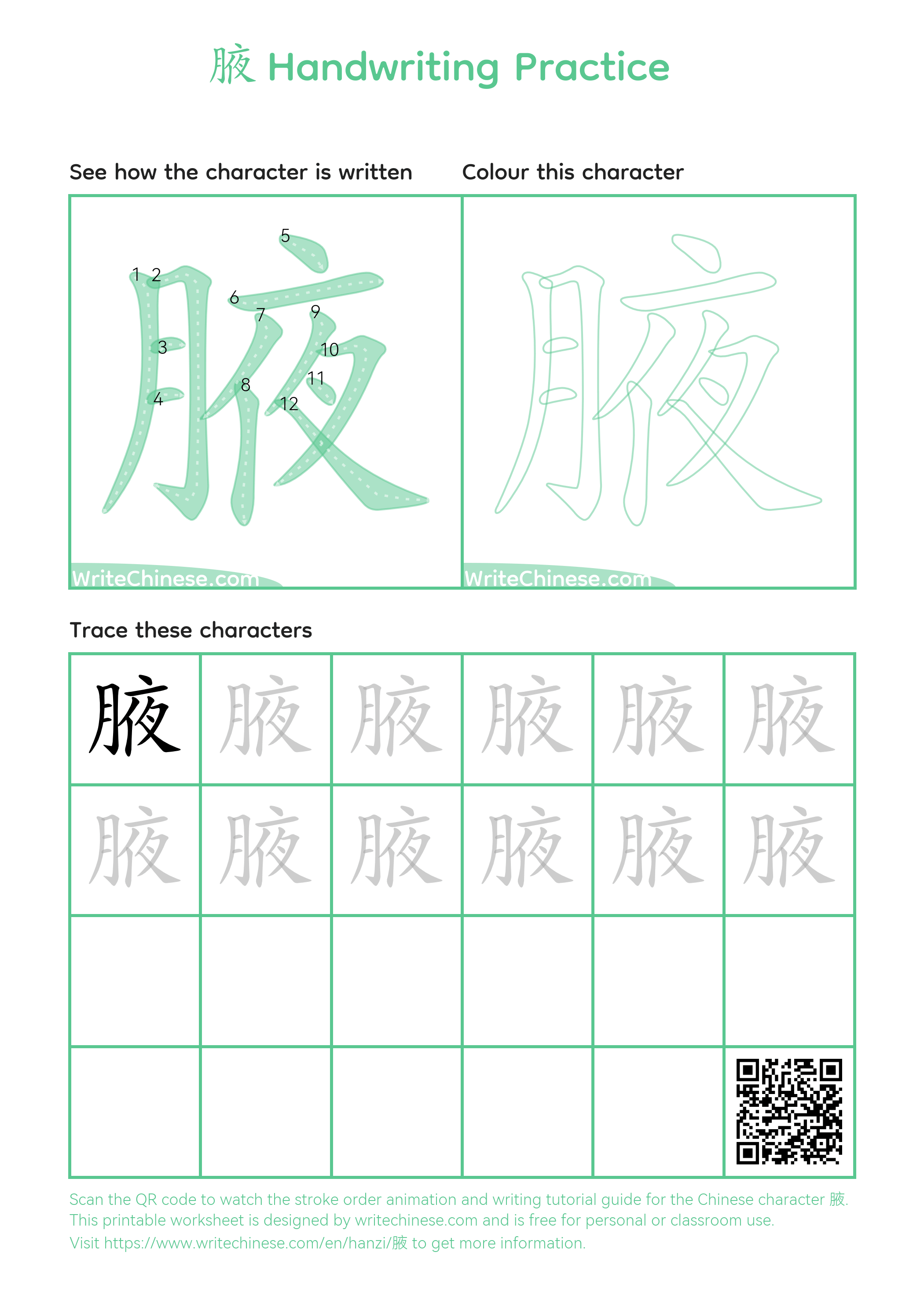 Printable Stroke Order Practice Worksheet of the Chinese character 腋