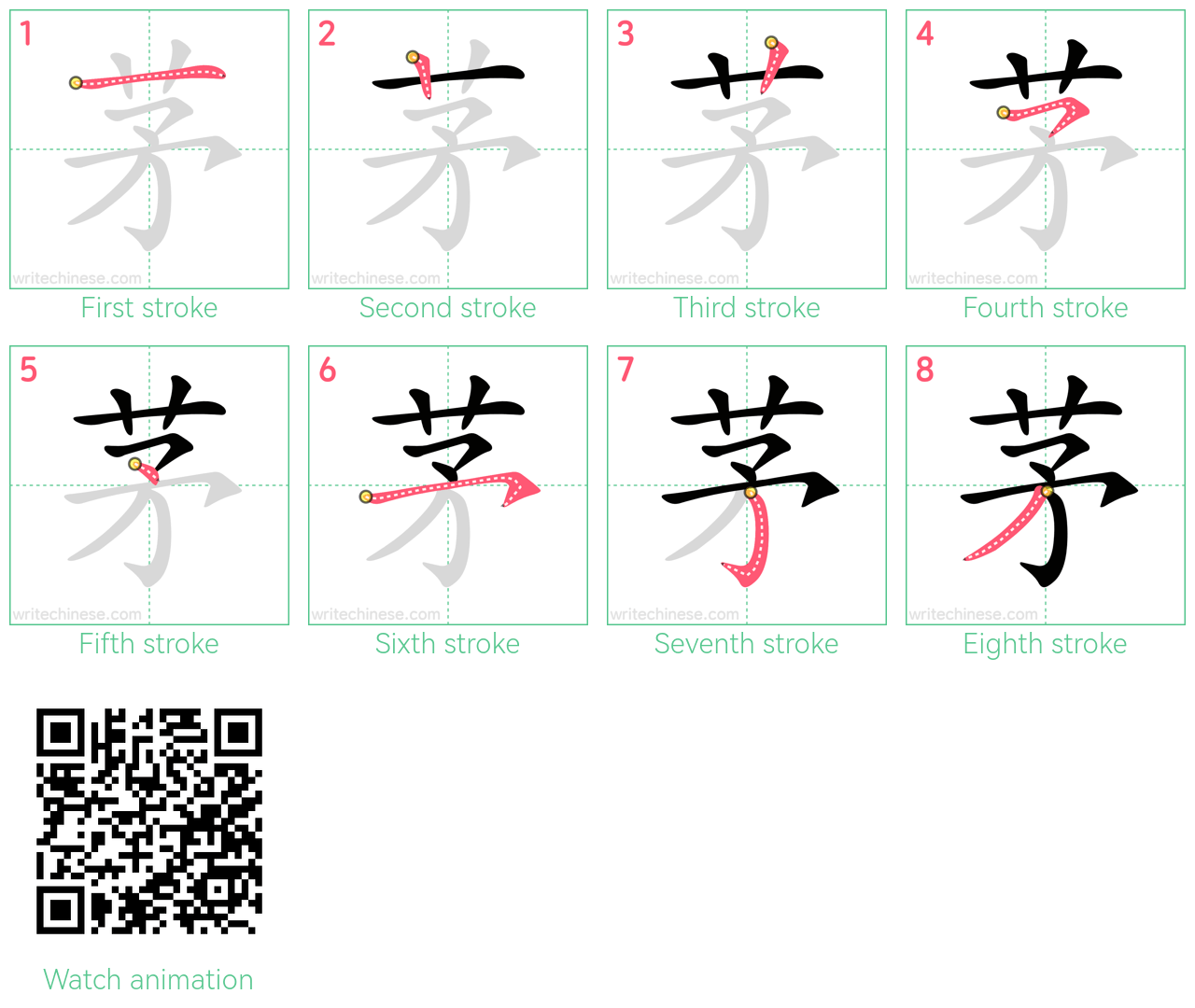 Learn to write the Chinese character "茅" by watching the stroke order animation of "茅".