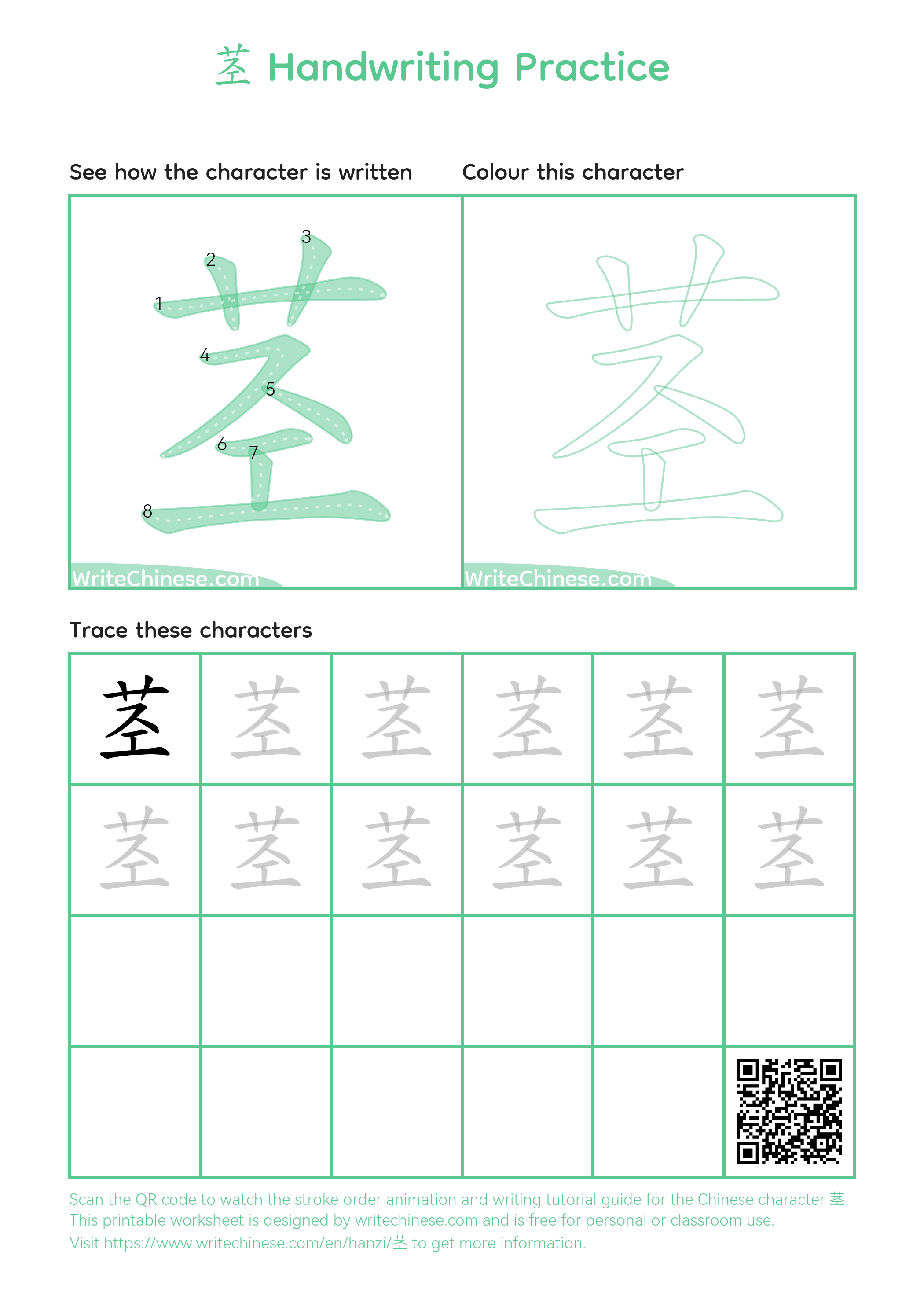 Learn the proper way to write the Chinese character '茎' through a video tutorial with a calligraphy teacher. Follow the Calligraphy Master's Step-by-Step Guide to Write the Chinese Character '茎'. You can download the printable handwriting worksheets below and practice writing together with pen and paper.
