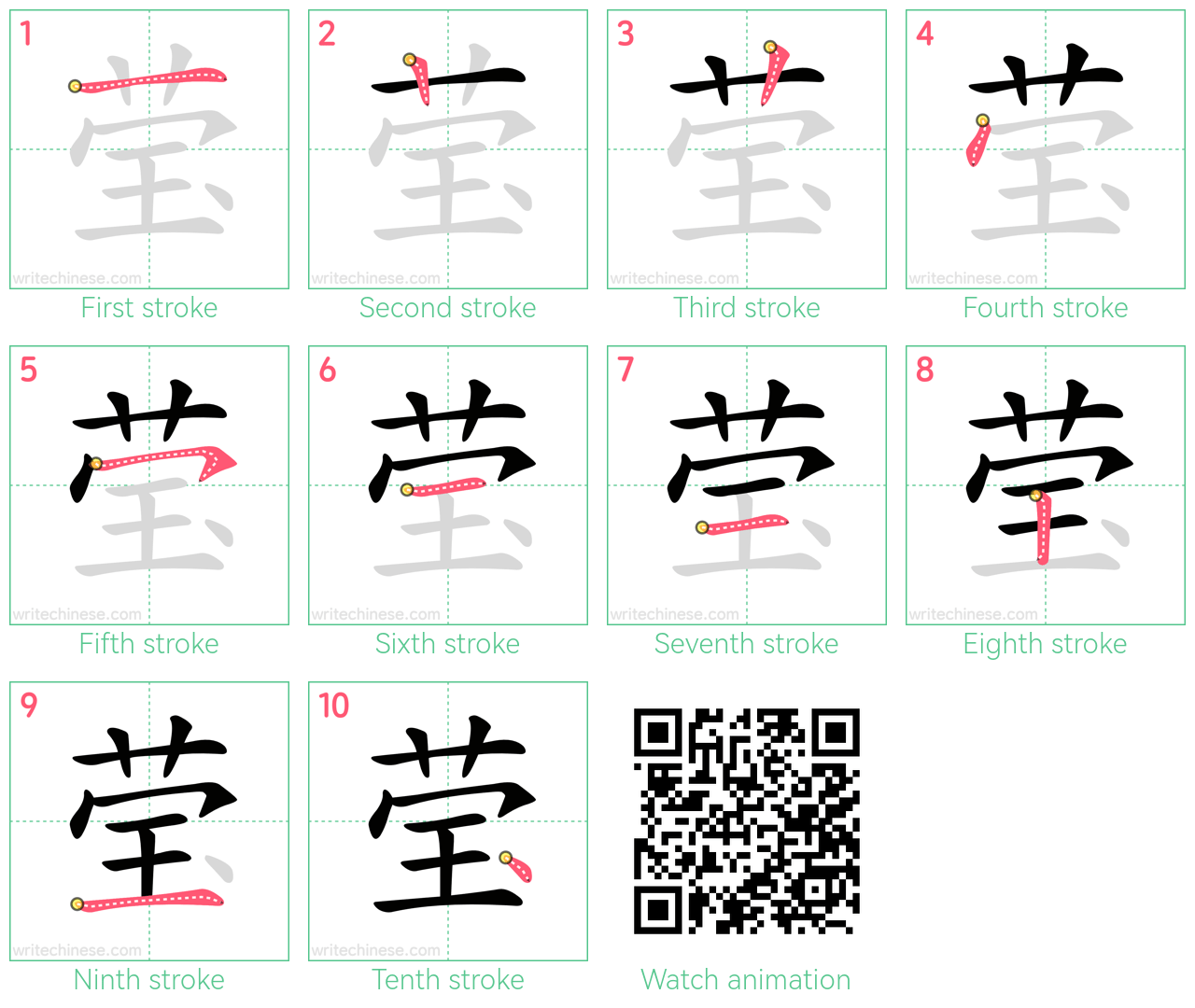 Master the Chinese character '莹' stroke by stroke with visual step-by-step instructions.