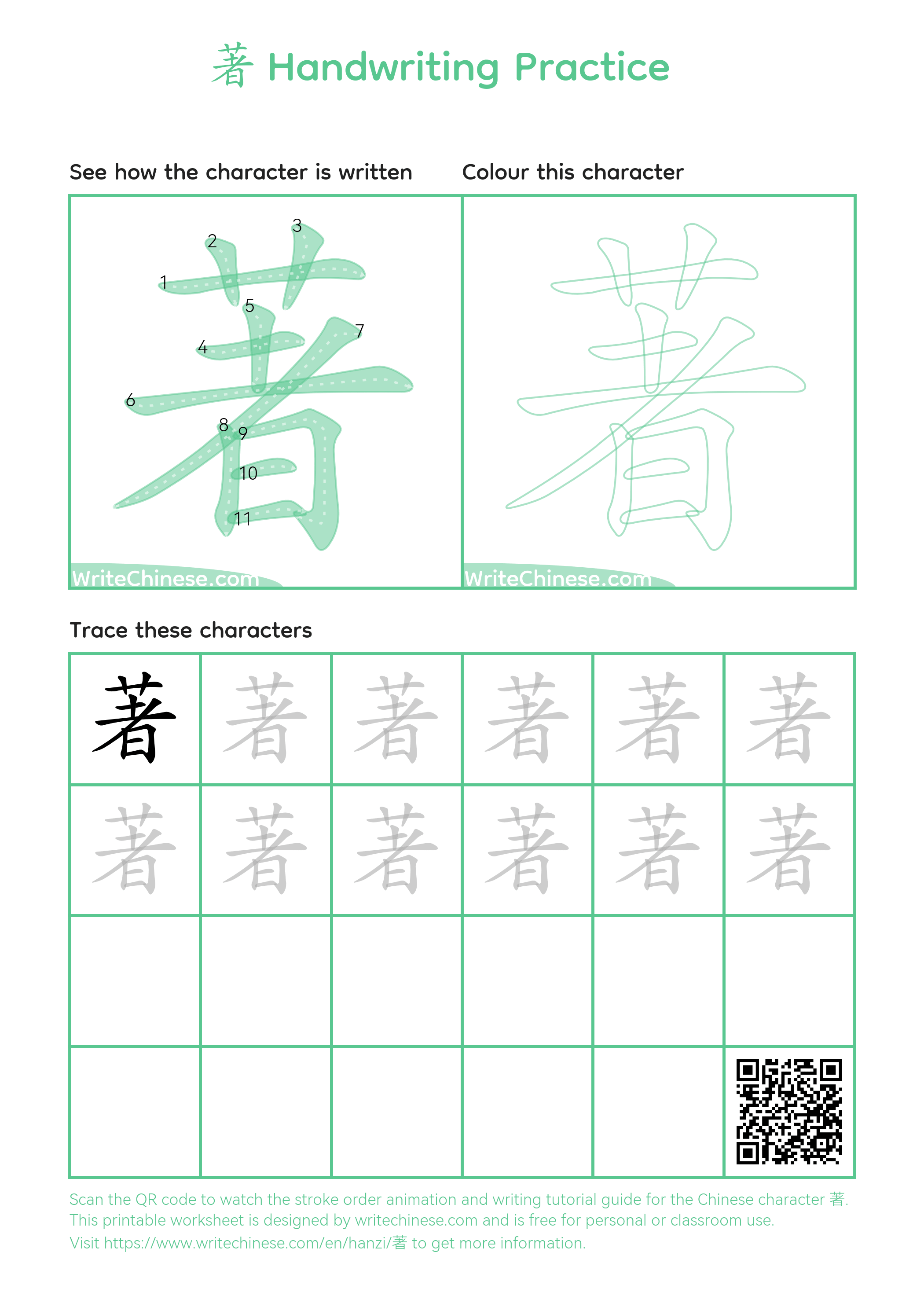 Learn the proper way to write the Chinese character '著' through a video tutorial with a calligraphy teacher. Follow the Calligraphy Master's Step-by-Step Guide to Write the Chinese Character '著'. You can download the printable handwriting worksheets below and practice writing together with pen and paper.