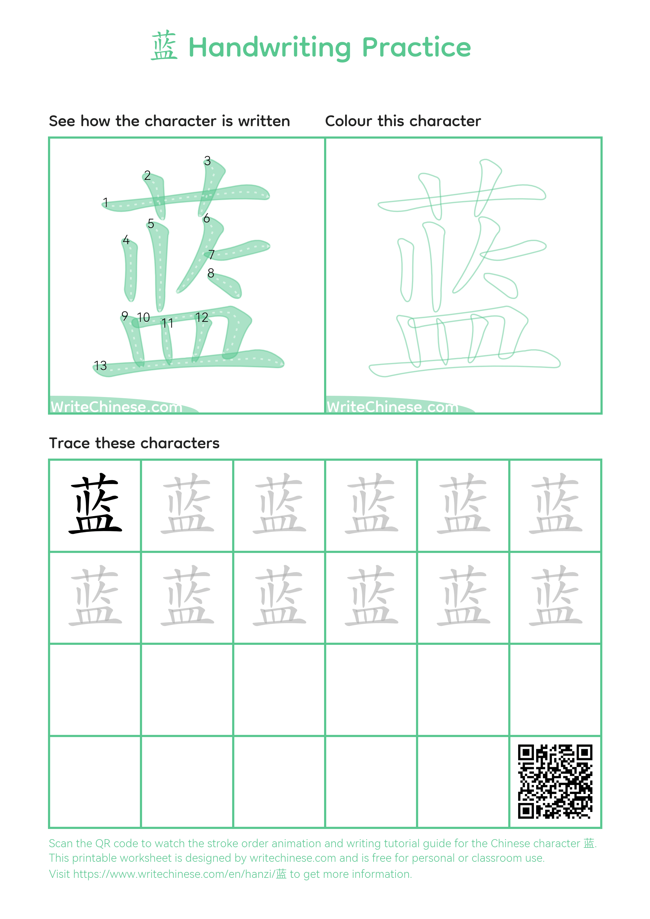 Learn the proper way to write the Chinese character '蓝' through a video tutorial with a calligraphy teacher. Follow the Calligraphy Master's Step-by-Step Guide to Write the Chinese Character '蓝'. You can download the printable handwriting worksheets below and practice writing together with pen and paper.