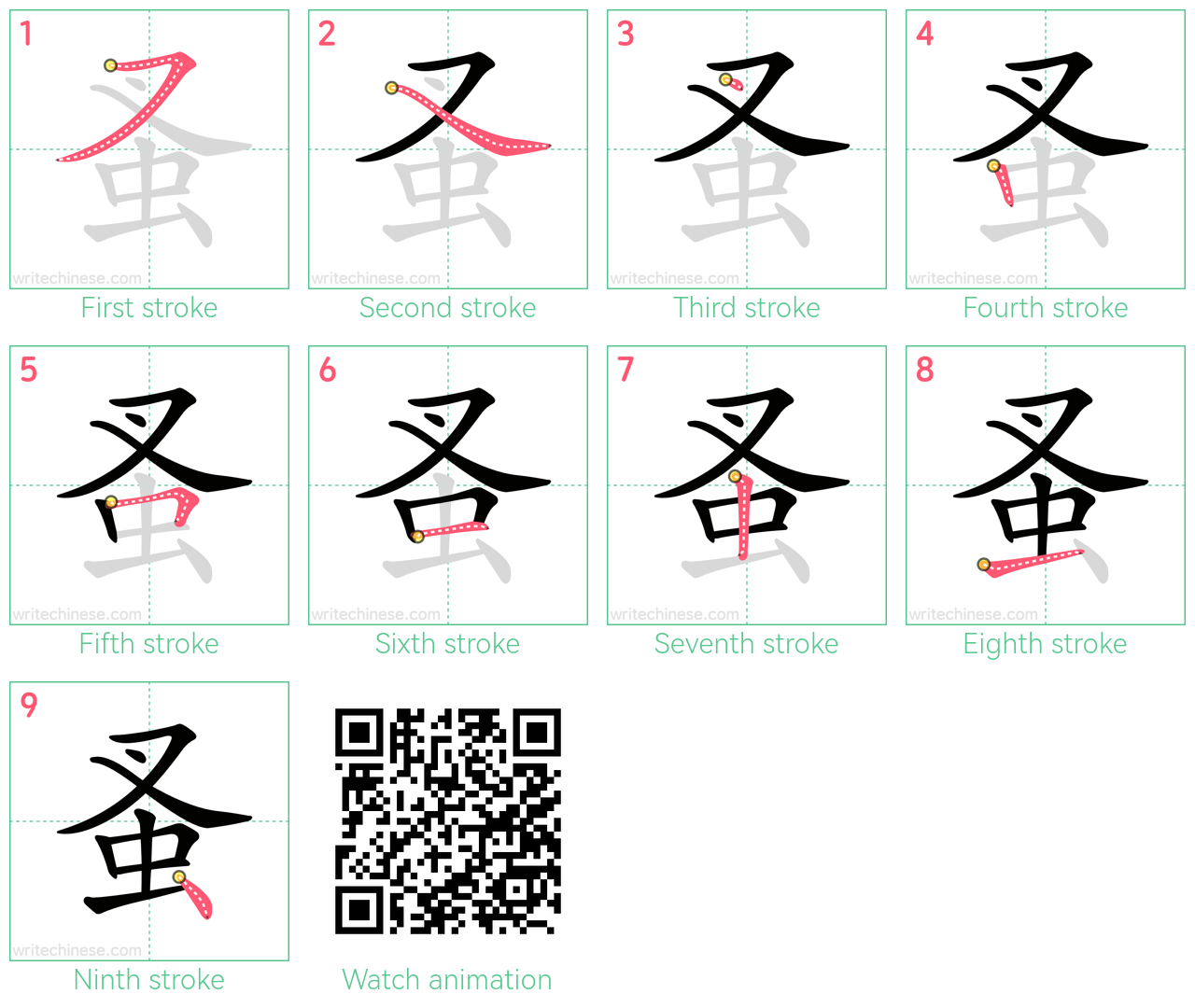 Master the Chinese character '蚤' stroke by stroke with visual step-by-step instructions.