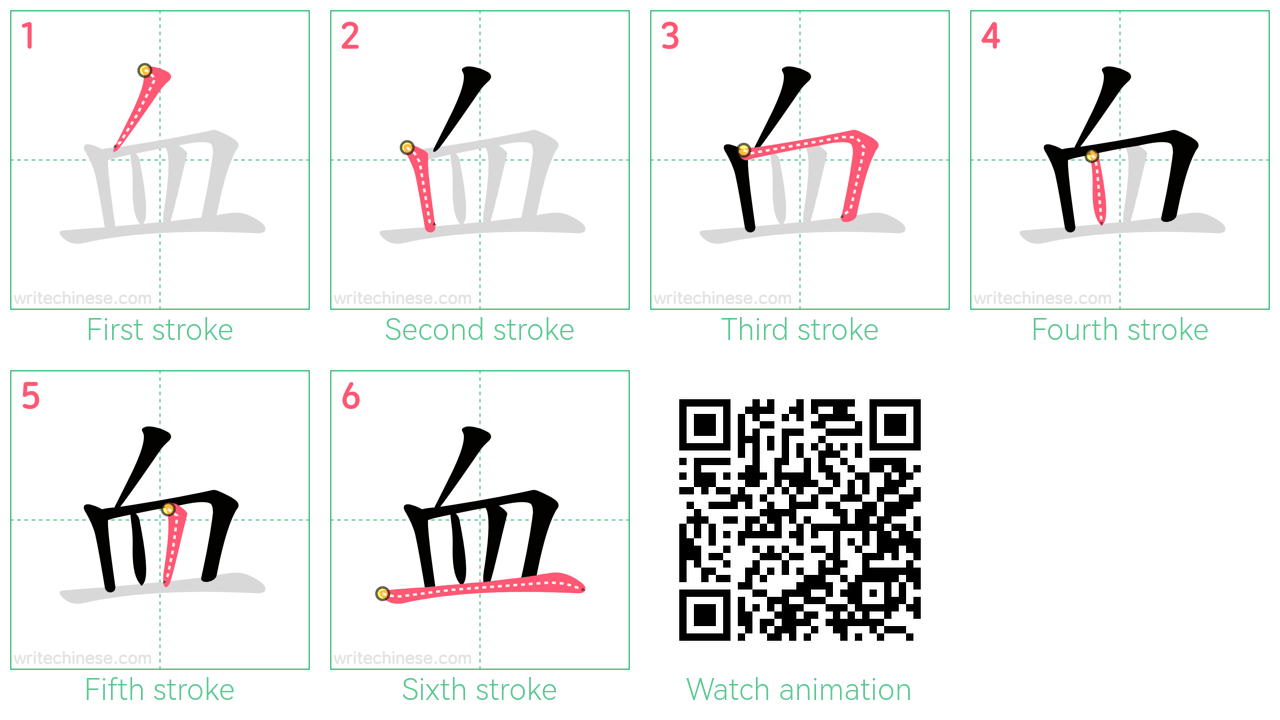 Learn to write the Chinese character "血" by watching the stroke order animation of "血".