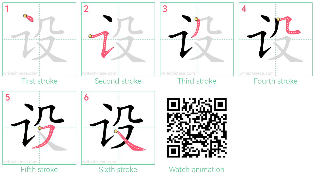 Learn to write the Chinese character "设" by watching the stroke order animation of "设".