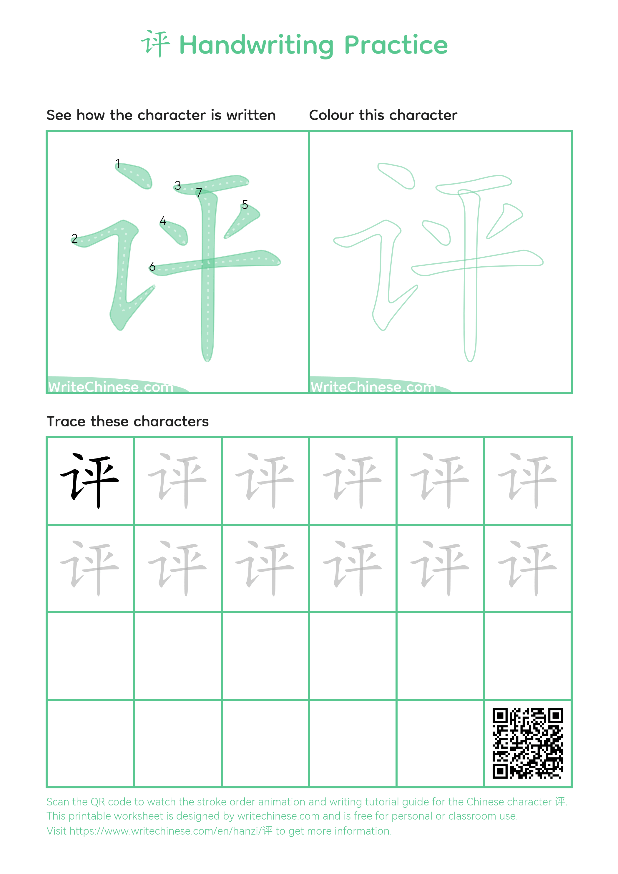 Chinese Character '评'. You can download the printable handwriting worksheets below and