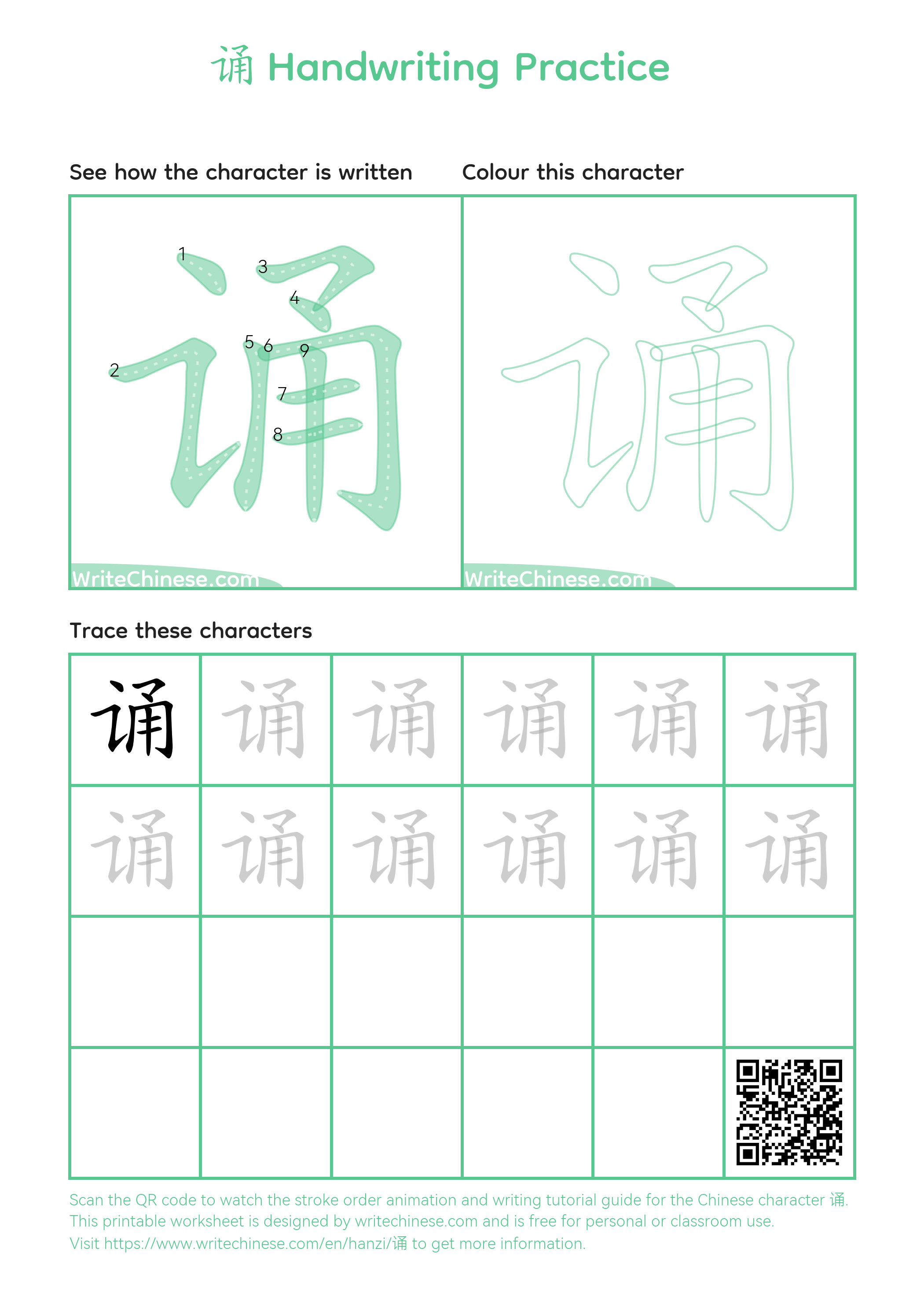 Chinese Character '诵'. You can download the printable handwriting worksheets below and