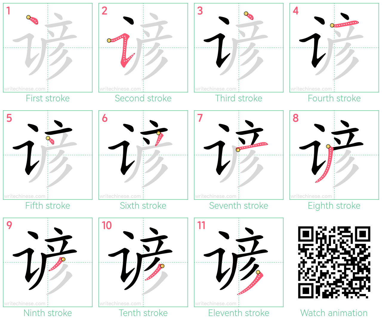 Master the Chinese character '谚' stroke by stroke with visual step-by-step instructions.