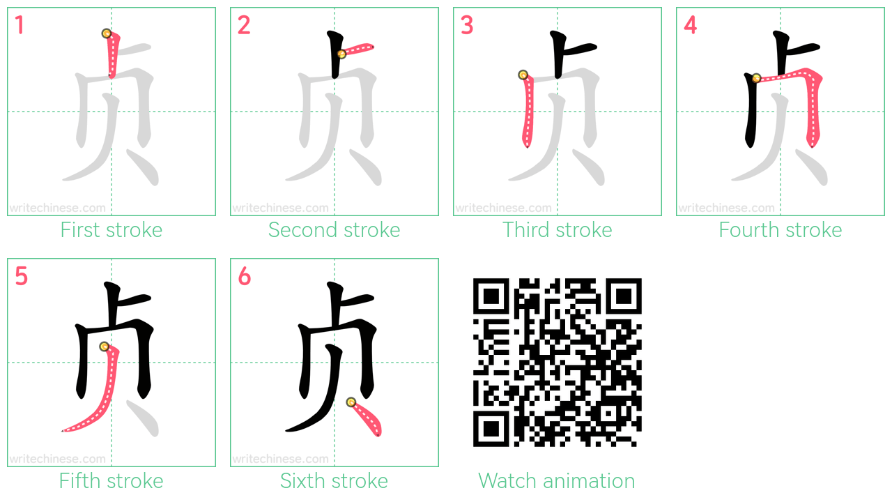 Master the Chinese character '贞' stroke by stroke with visual step-by-step instructions.