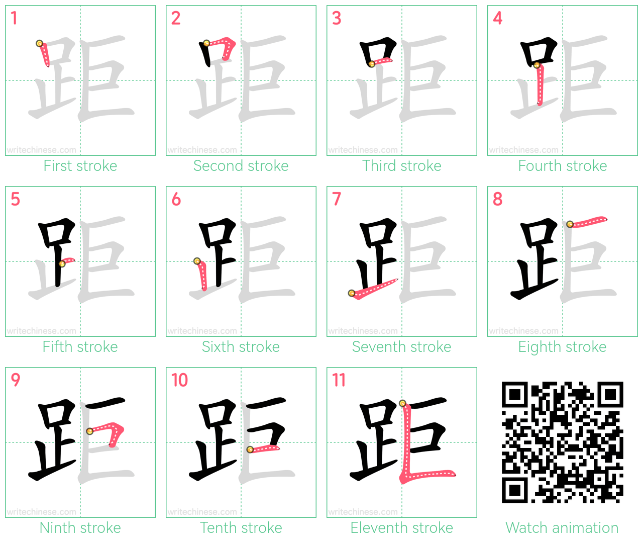 Master the Chinese character '距' stroke by stroke with visual step-by-step instructions.