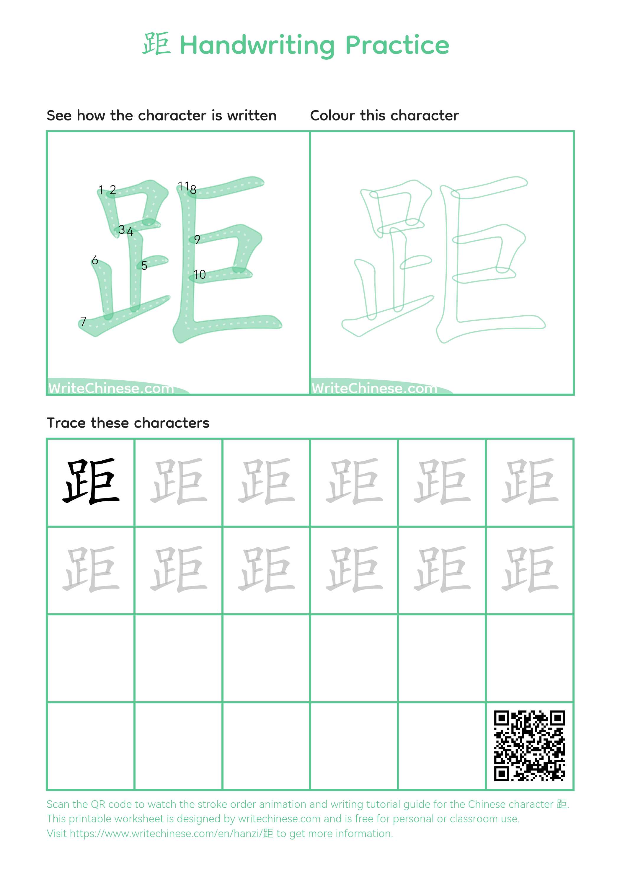 Chinese Character '距'. You can download the printable handwriting worksheets below and