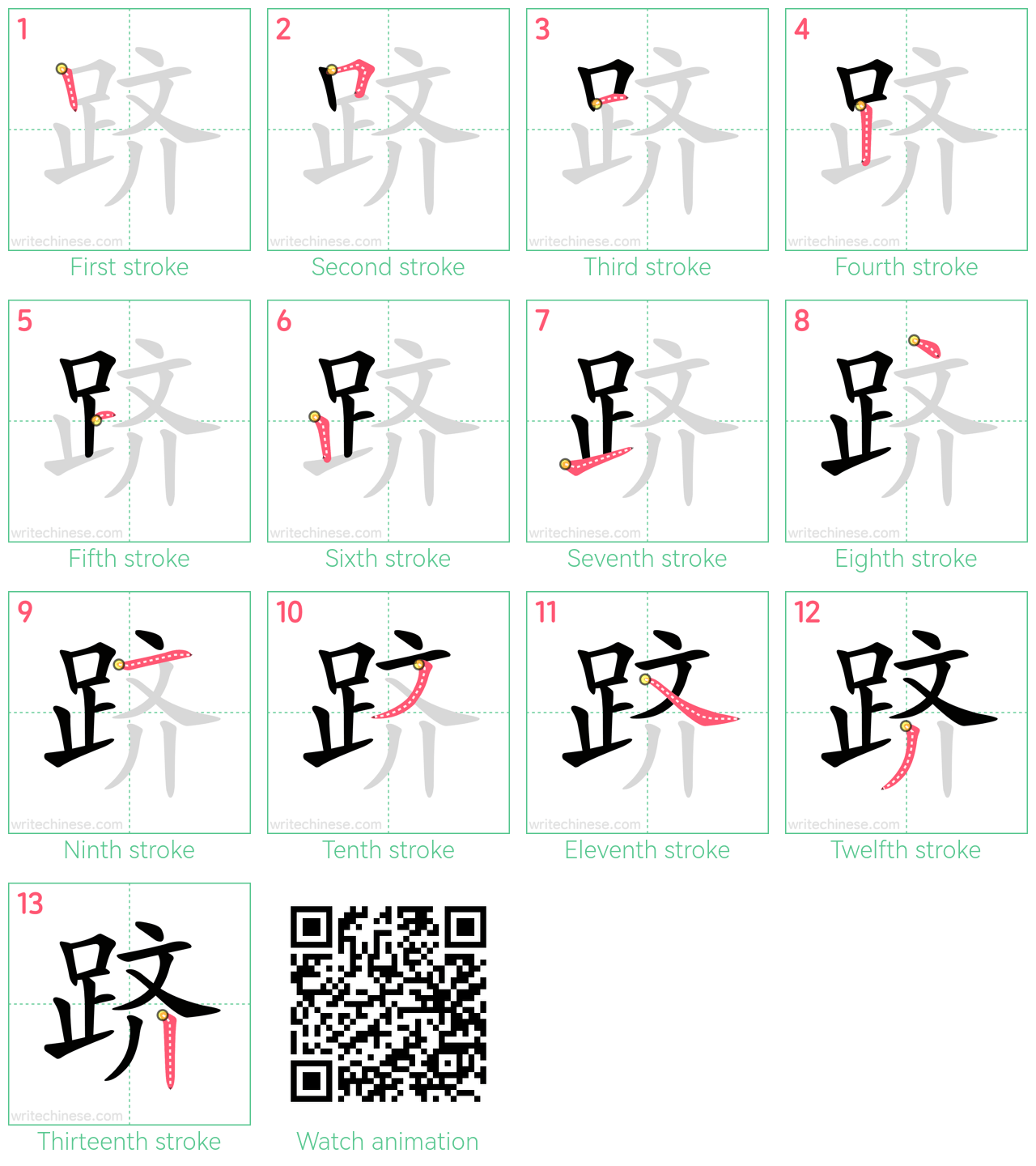 Master the Chinese character '跻' stroke by stroke with visual step-by-step instructions.