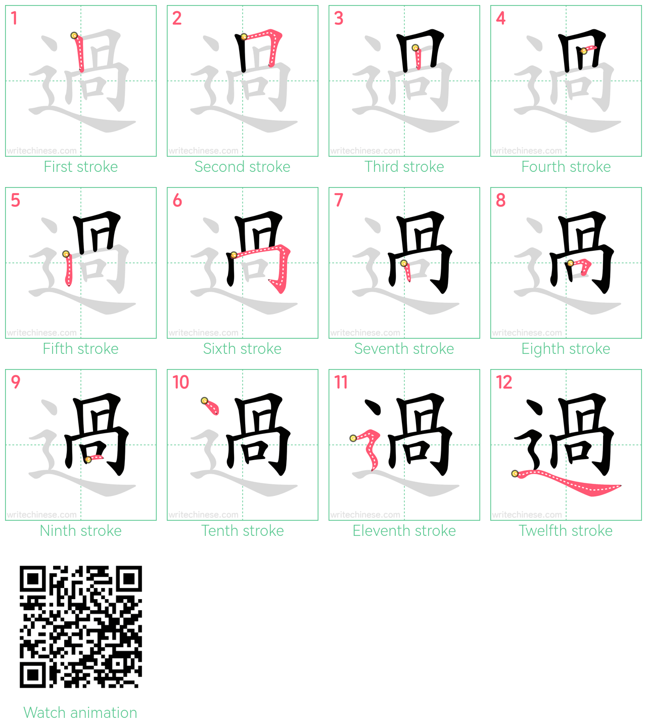 Master the Chinese character '過' stroke by stroke with visual step-by-step instructions.