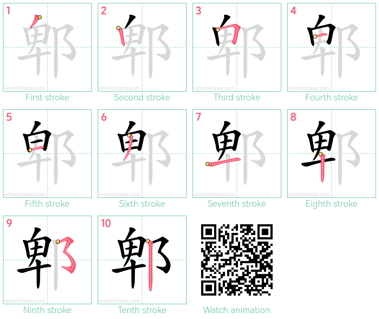 Learn to write the Chinese character "郫" by watching the stroke order animation of "郫".