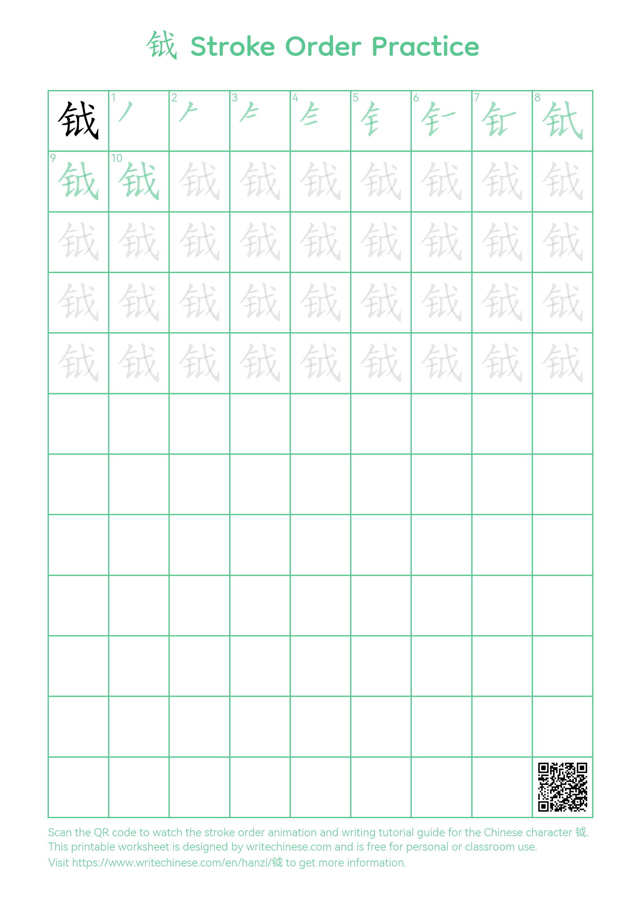 Chinese Character '钺'. You can download the printable handwriting worksheets below and