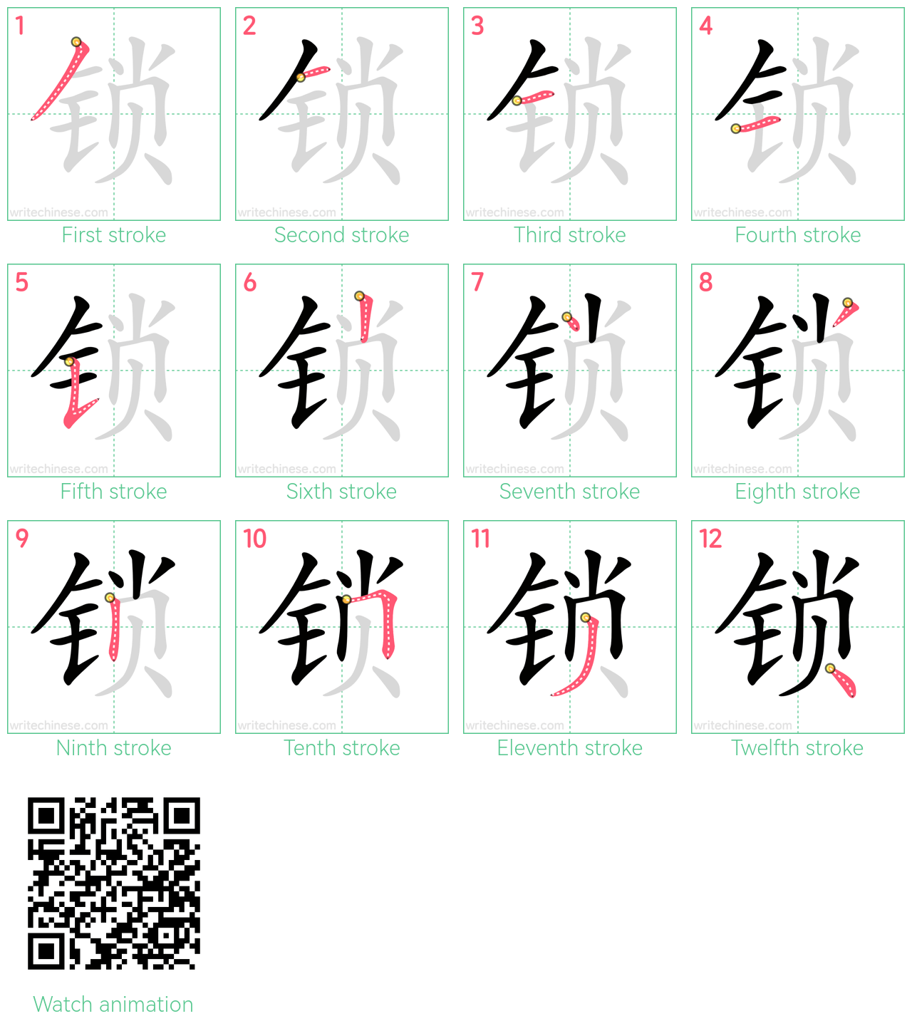 Master the Chinese character '锁' stroke by stroke with visual step-by-step instructions.