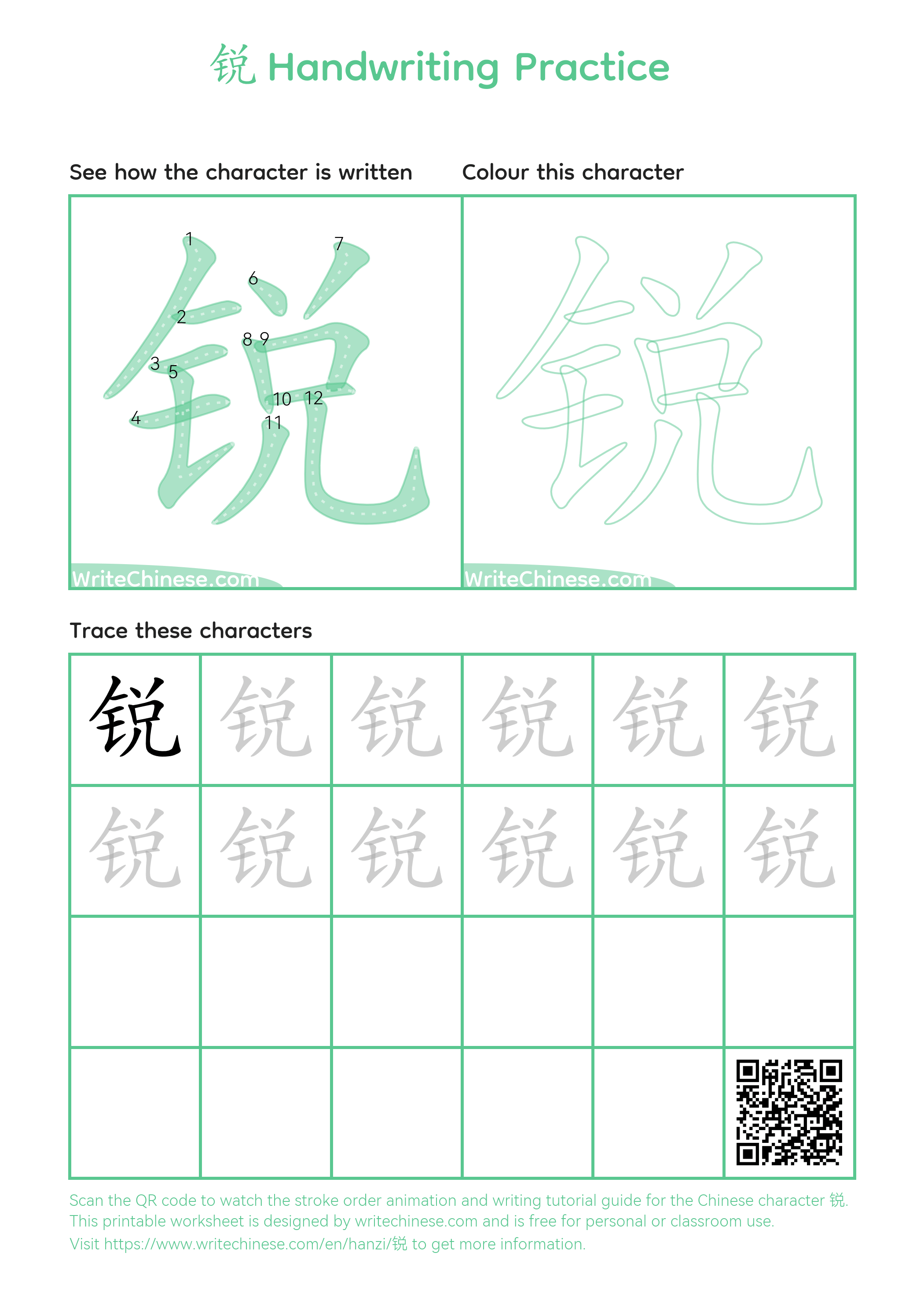 Chinese Character '锐'. You can download the printable handwriting worksheets below and
