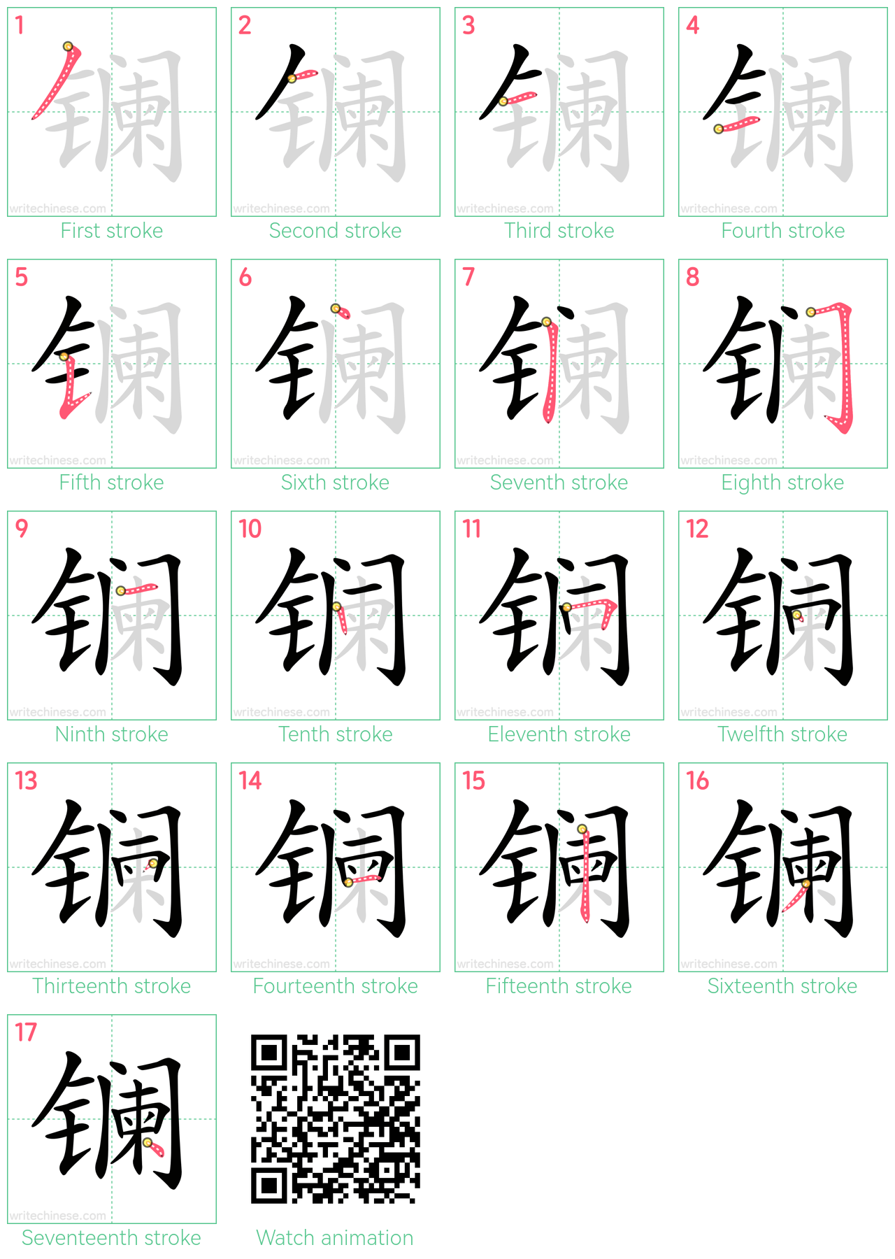 Master the Chinese character '镧' stroke by stroke with visual step-by-step instructions.