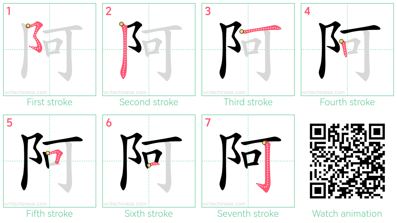 Master the Chinese character '阿' stroke by stroke with visual step-by-step instructions.