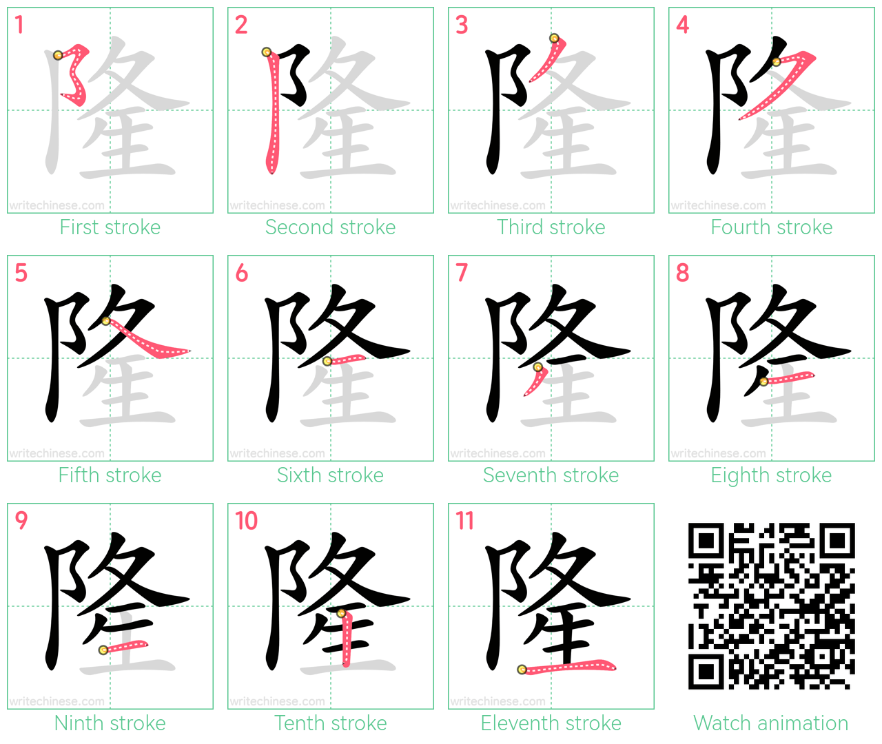 Master the Chinese character '隆' stroke by stroke with visual step-by-step instructions.