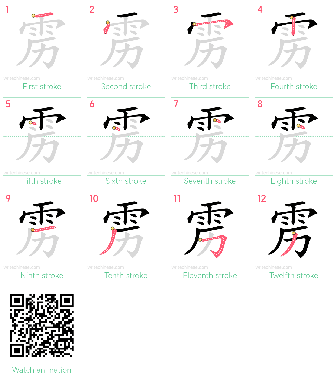 Learn to write the Chinese character "雳" by watching the stroke order animation of "雳".