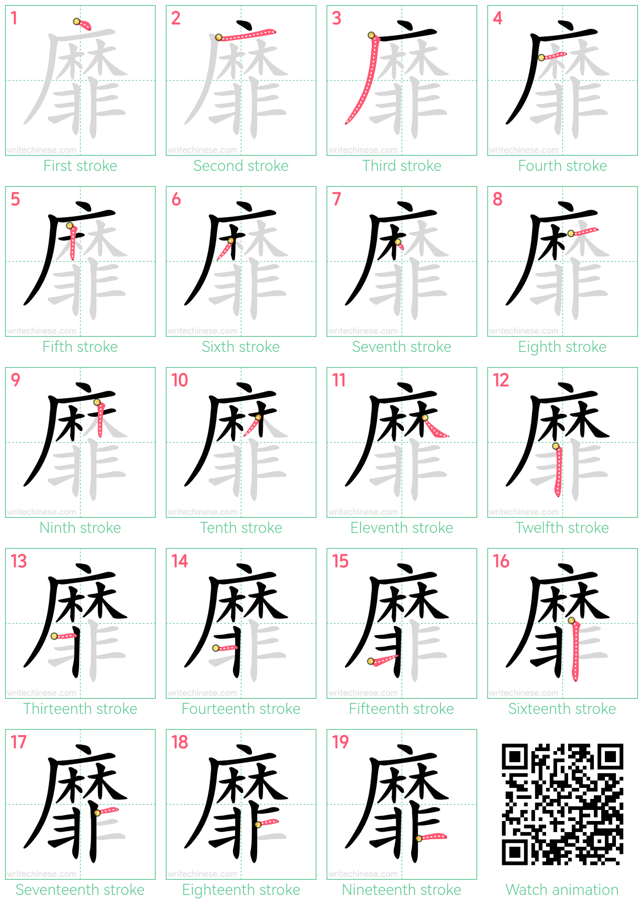 Master the Chinese character '靡' stroke by stroke with visual step-by-step instructions.