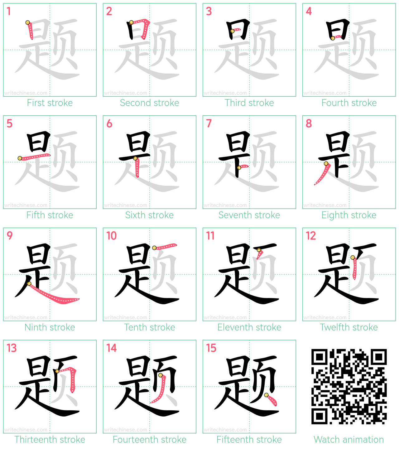 Master the Chinese character '题' stroke by stroke with visual step-by-step instructions.