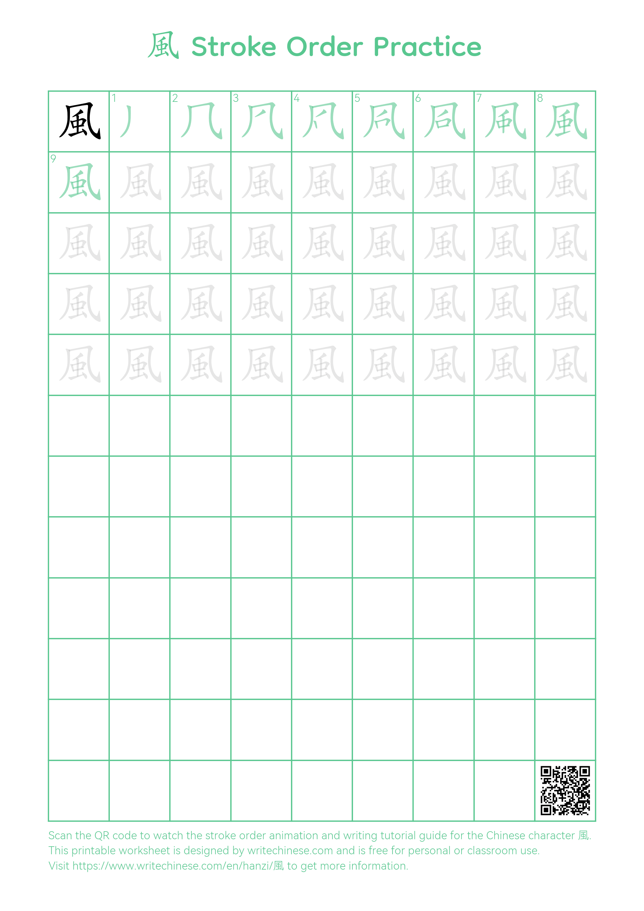 Printable Stroke Order Practice Worksheet of the Chinese character 風