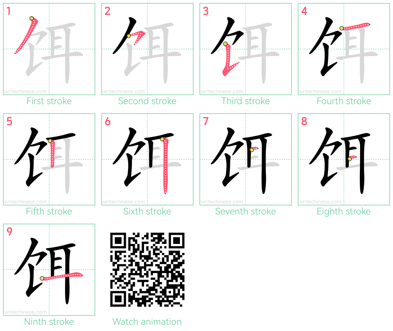Master the Chinese character '饵' stroke by stroke with visual step-by-step instructions.