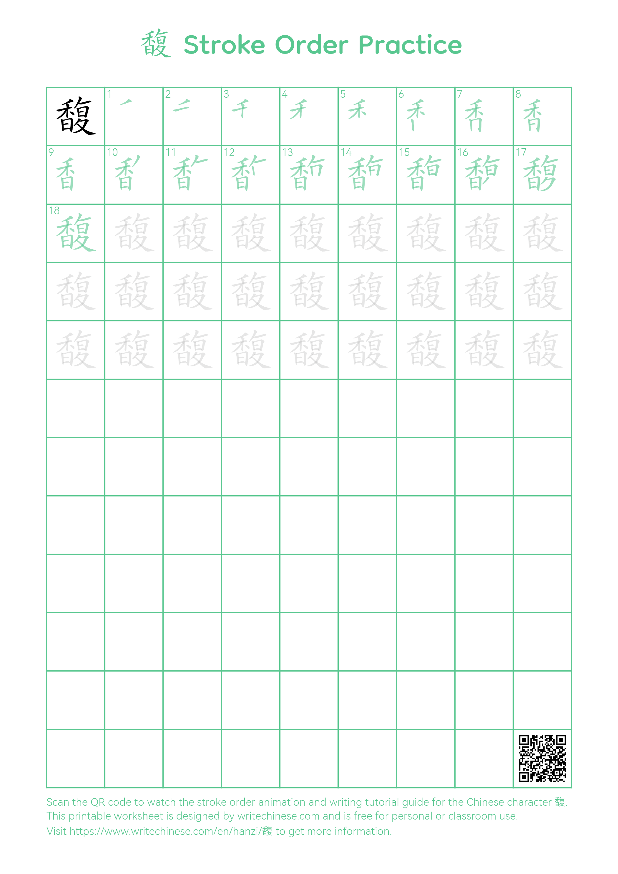 Learn the proper way to write the Chinese character '馥' through a video tutorial with a calligraphy teacher. Follow the Calligraphy Master's Step-by-Step Guide to Write the Chinese Character '馥'. You can download the printable handwriting worksheets below and practice writing together with pen and paper.