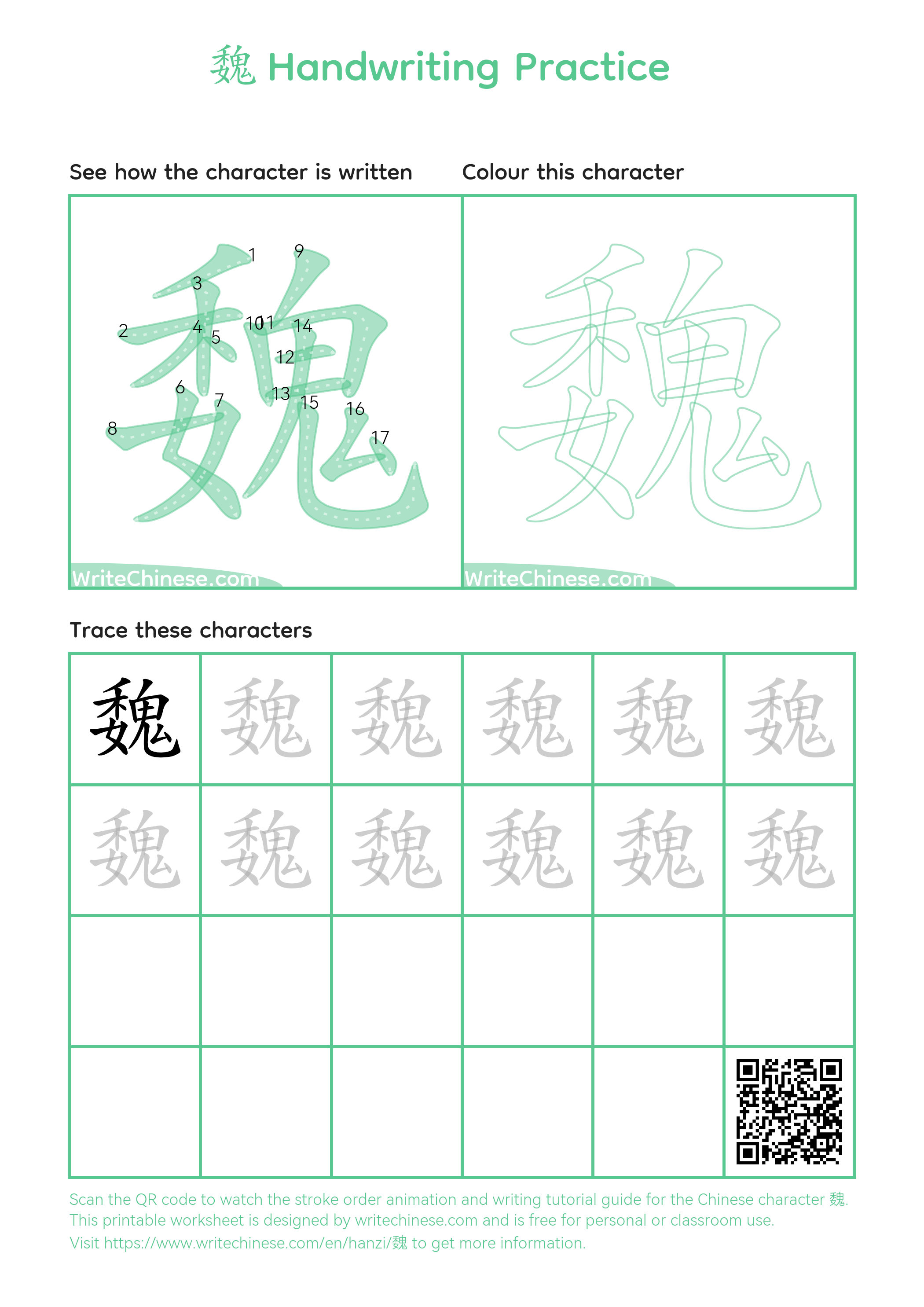 Chinese Character '魏'. You can download the printable handwriting worksheets below and