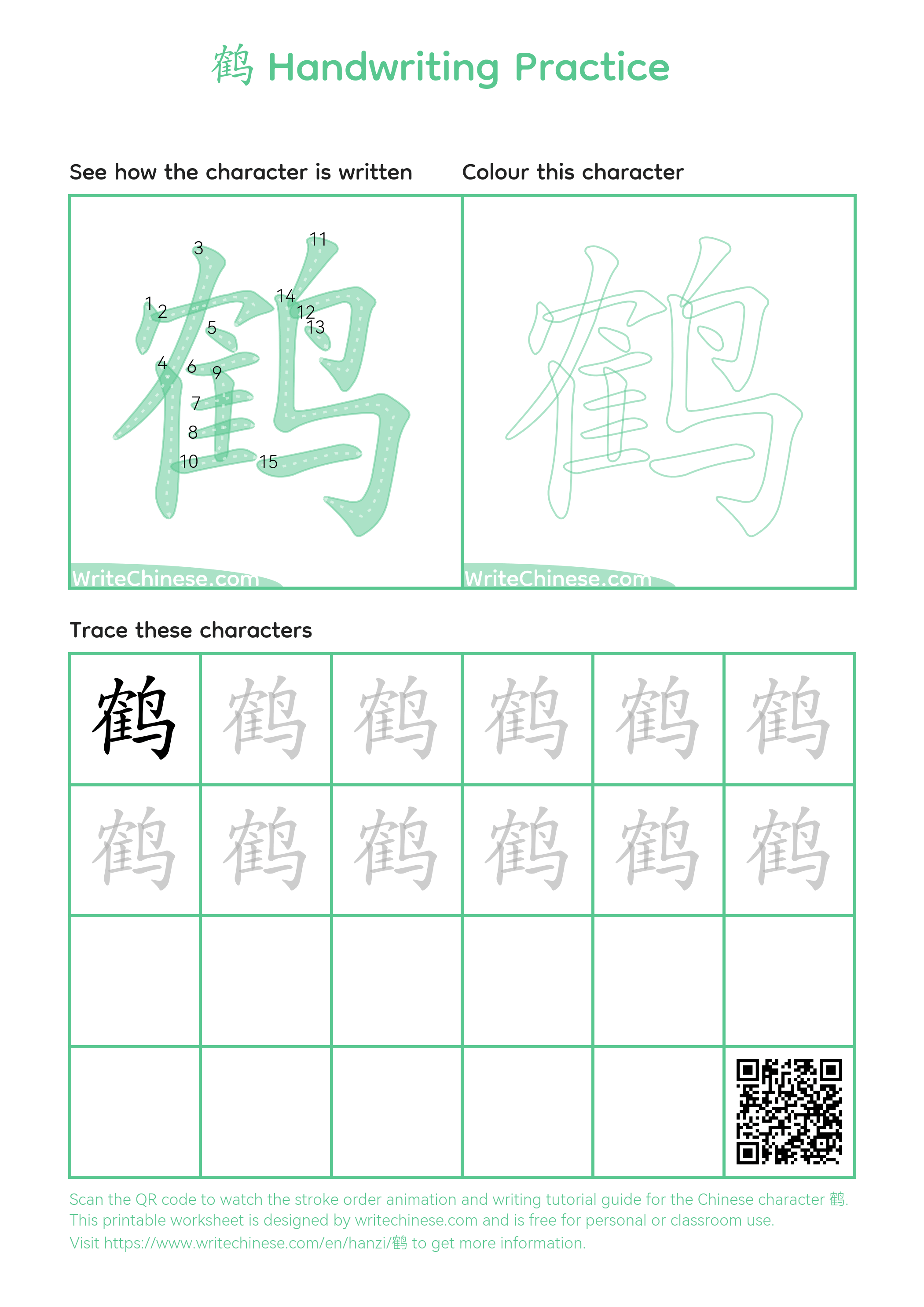 Chinese Character '鹤'. You can download the printable handwriting worksheets below and